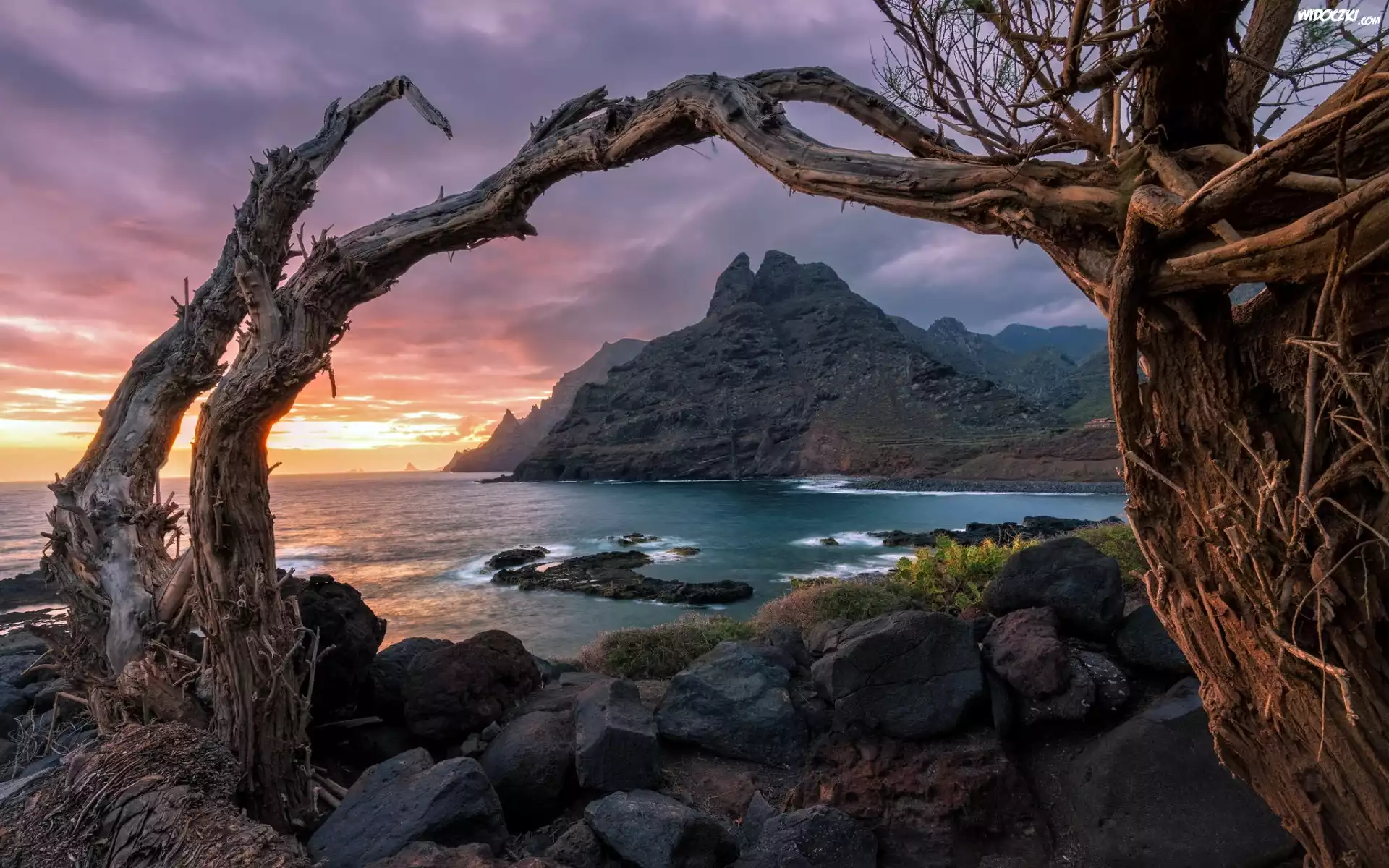 Zdjęcia, Morze, Brzeg, Skały, Góry, Drzewo, Gałęzie, Kamienie, Niebo, Chmury, Zachód słońca