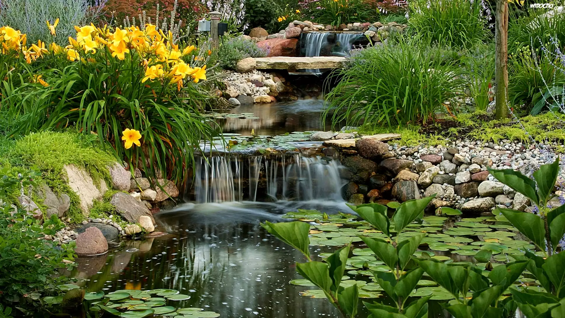 Zdjęcia, Ogród, Kamienie, Kaskada, Rośliny, Żółte, Kwiaty, Trawa