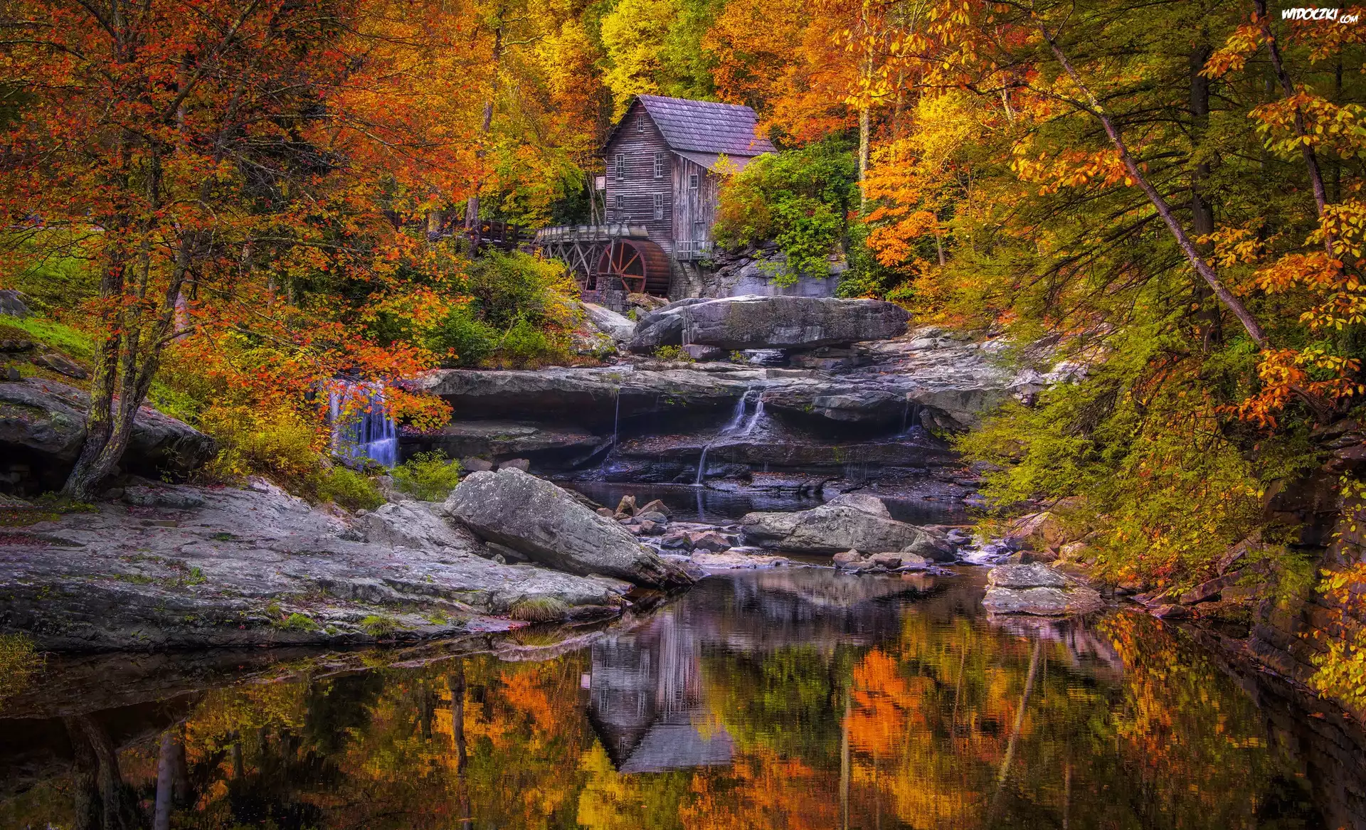 Stany Zjednoczone, Wirginia Zachodnia, Park Stanowy Babcock, Młyn, Jesień, Kamienie