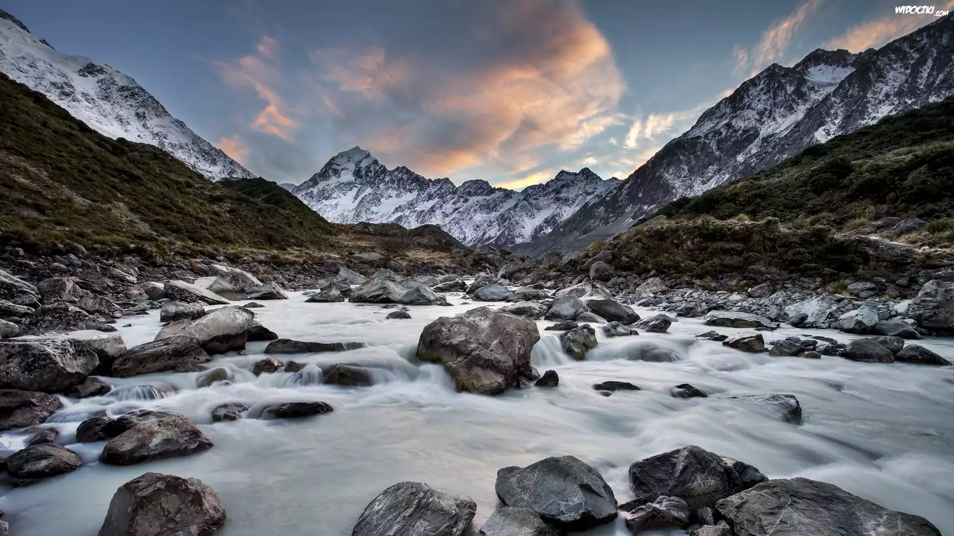 Zdjęcia, Nowa Zelandia, Park Narodowy Góry Cooka, Góry, Rzeka, Kamienie