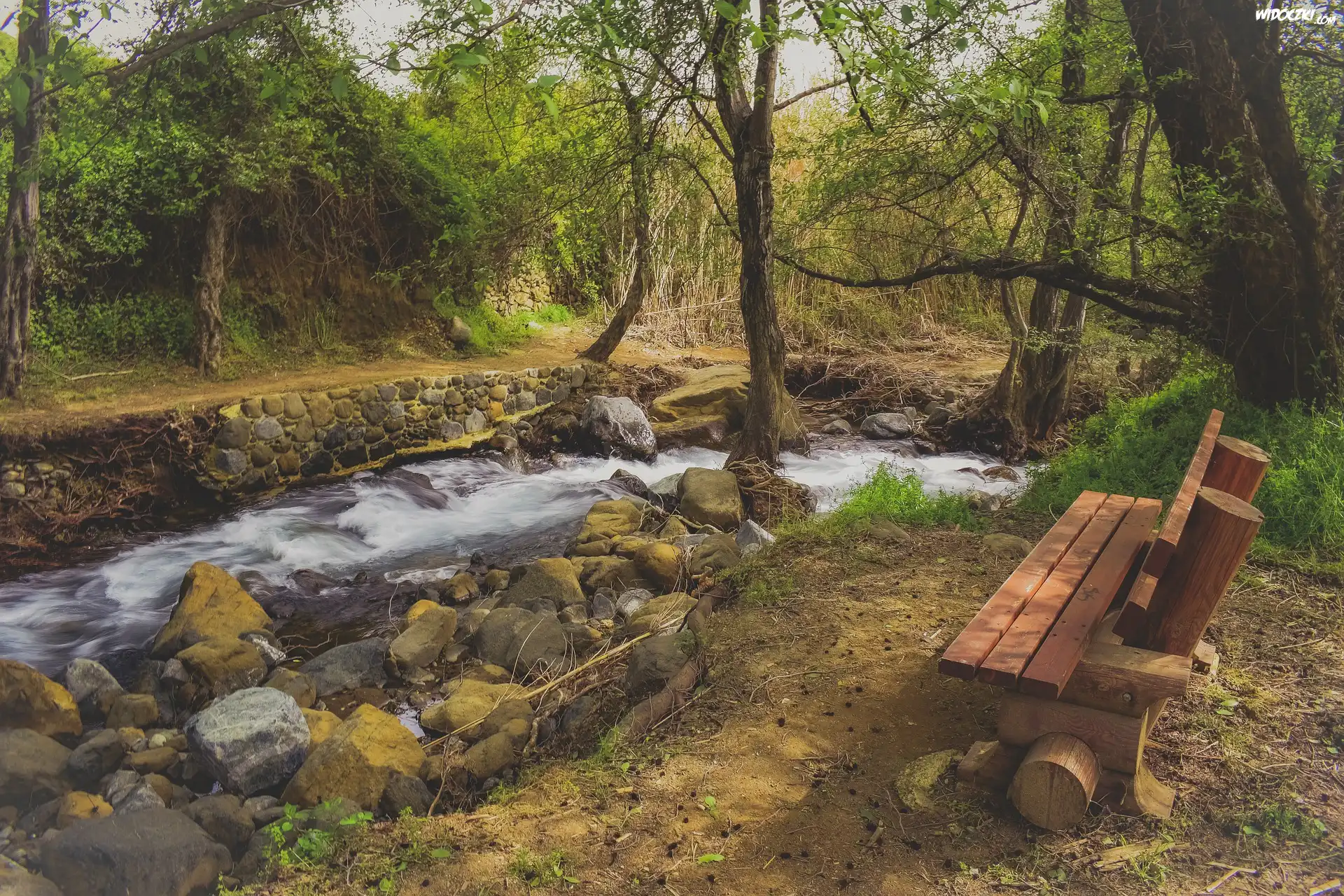 Ławka, Potok, Rzeka, Kamienie, Drzewa