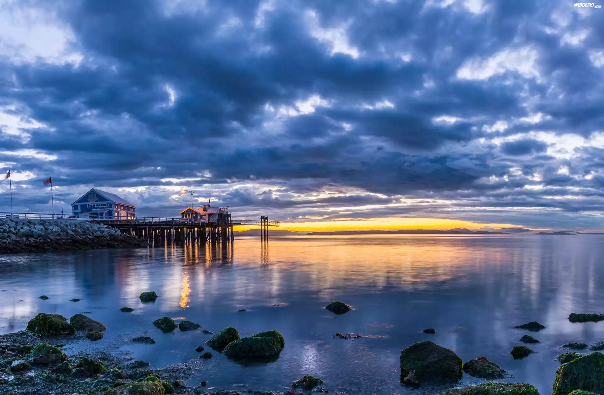 Zdjęcia, Kanada, Sidney, Morze, Molo, Restauracja, Sklep, Wschód słońca, Chmury, Kamienie