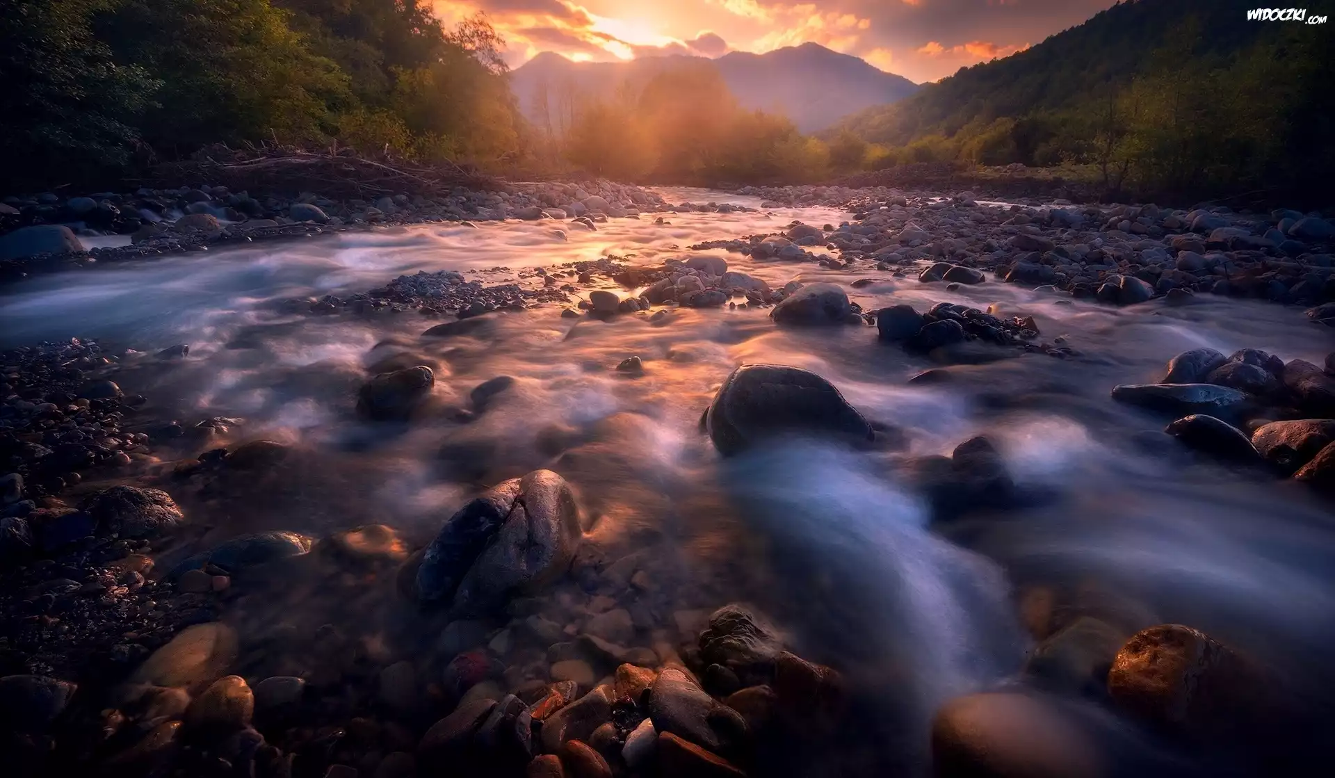 Zdjęcia, Rzeka, Kamienie, Las, Góry, Wschód słońca, Las