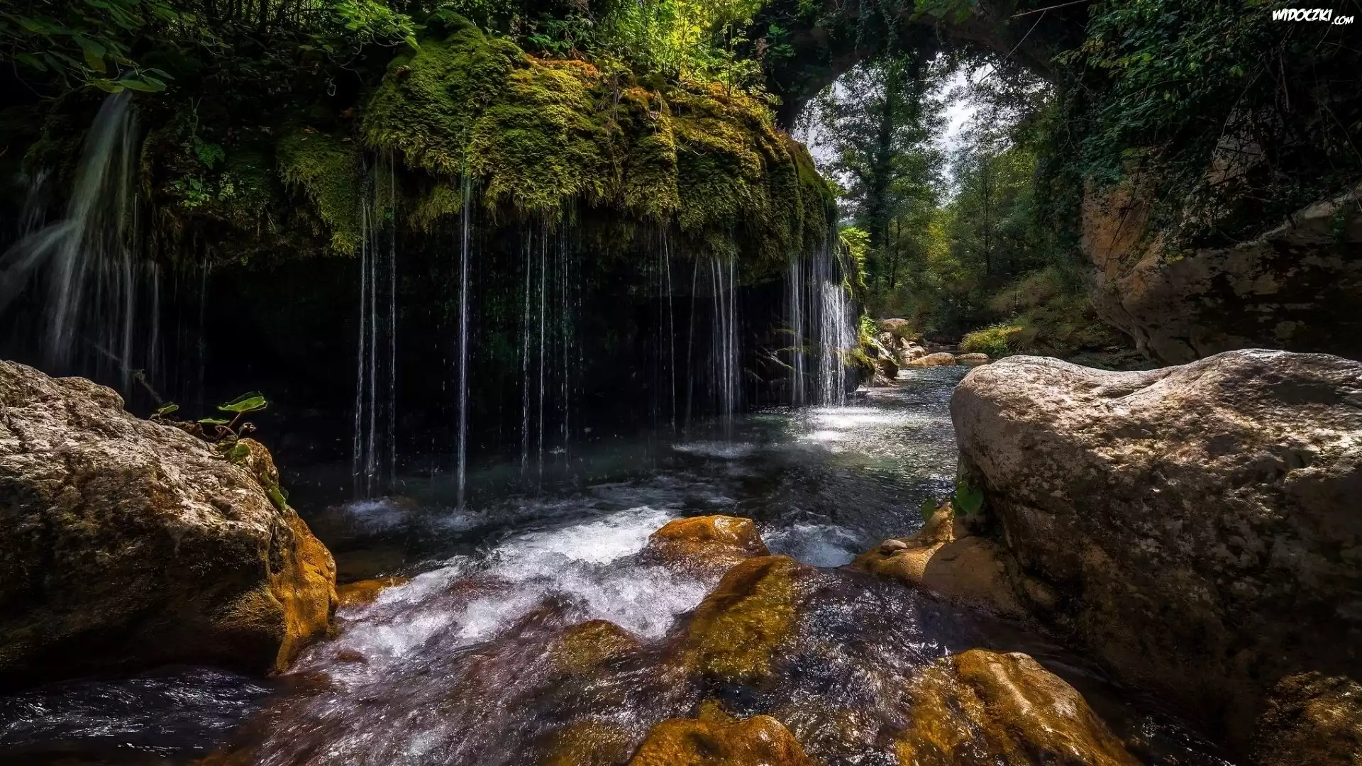 Zdjęcia, Rzeka, Kamienie, Skały, Drzewa, Roślinność, Mech, Wodospad