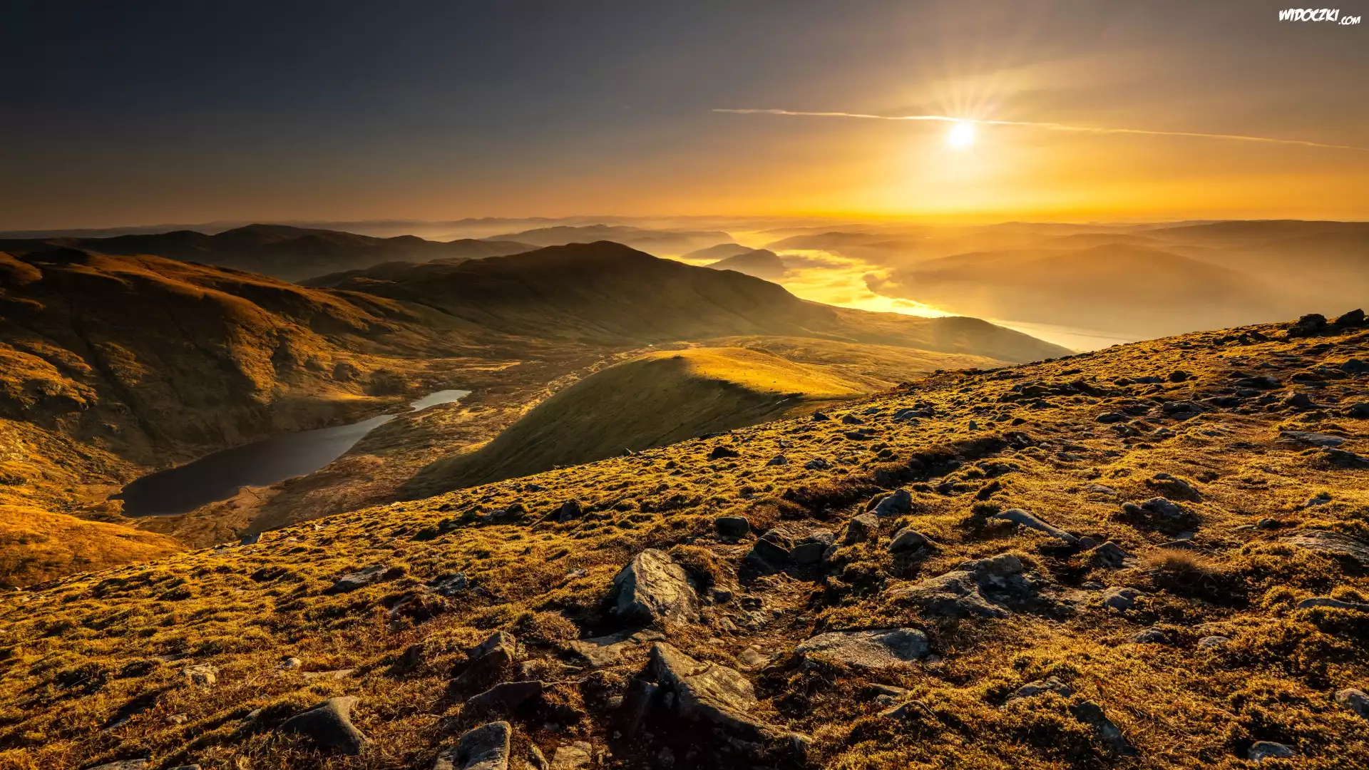 Zdjęcia, Wzgórza, Góry, Jezioro, Kamienie, Zachód słońca