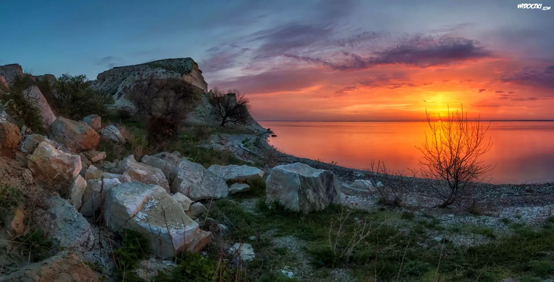 Zdjęcia, Kamienie, Zachód, Słońca, Jezioro