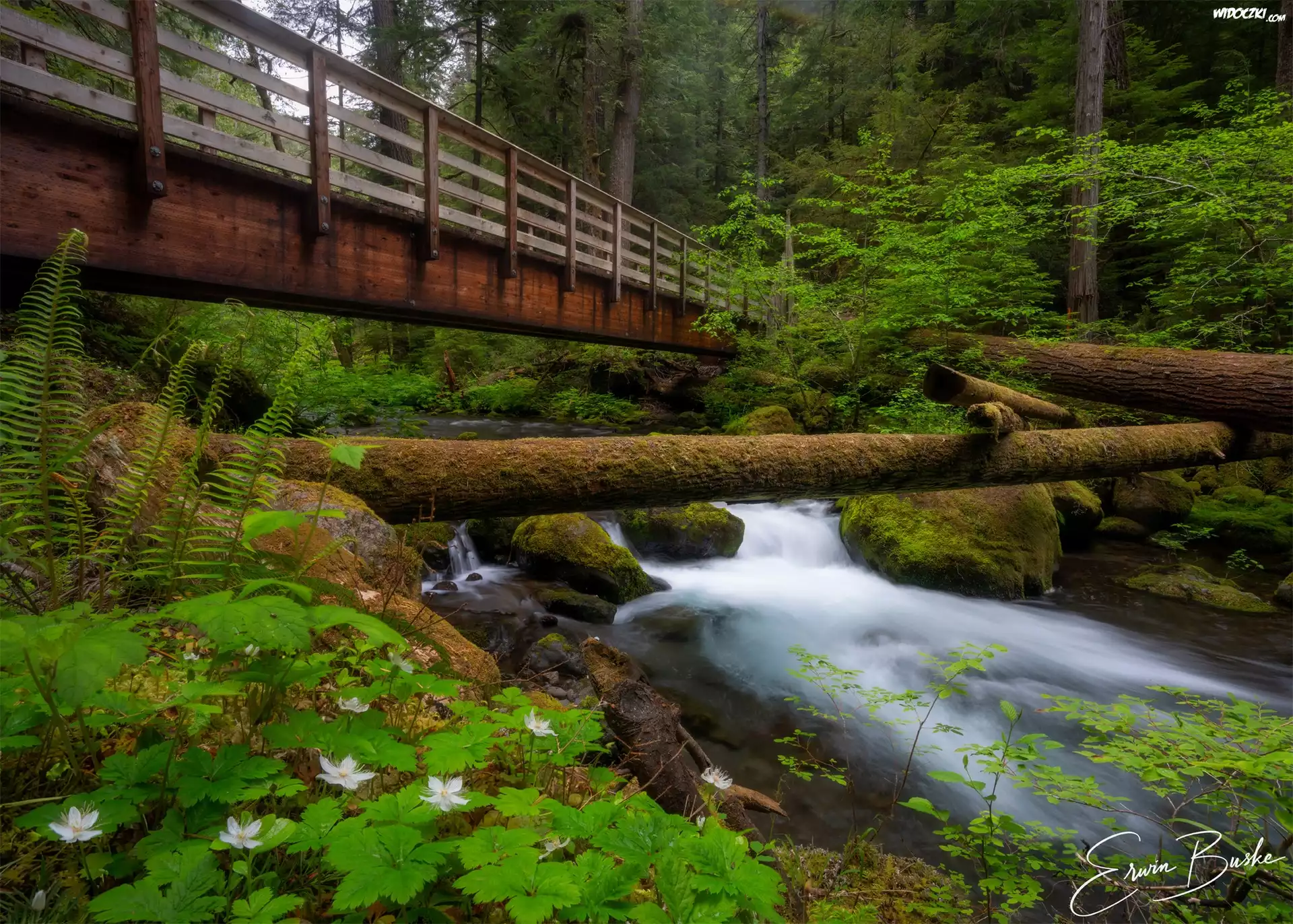 Rzeka, Big Quilcene, Most, Powalone, Drzewa, Omszałe, Kamienie, Paprocie, Kwiaty, Drzewa, Stan Waszyngton, Stany Zjednoczone |