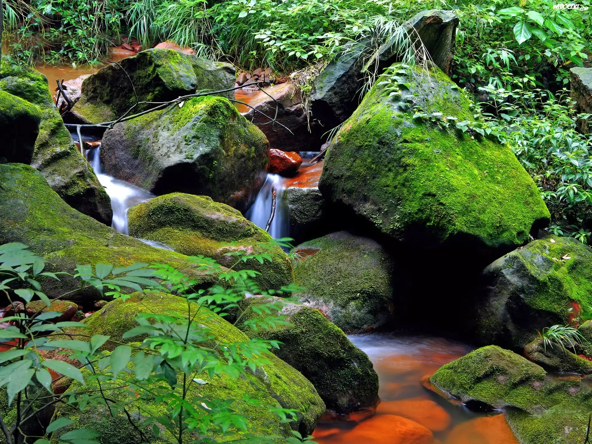 Zdjęcia, Kamienie, Mech, Strumyk, Zieleń