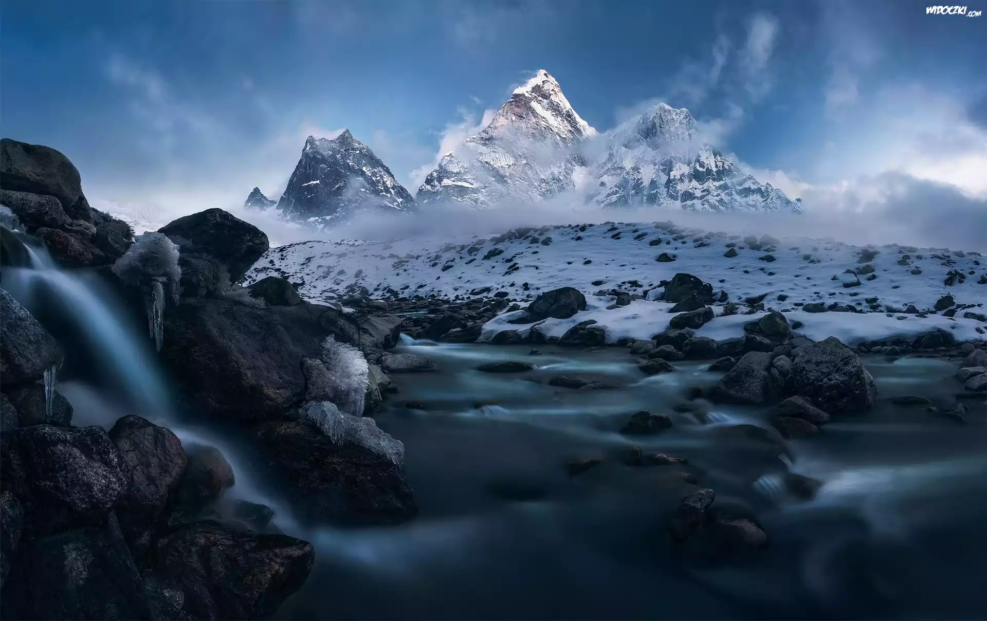 Zdjęcia, Nepal, Himalaje, Szczyt Ama Dablam, Zima, Góry, Rzeka, Kamienie