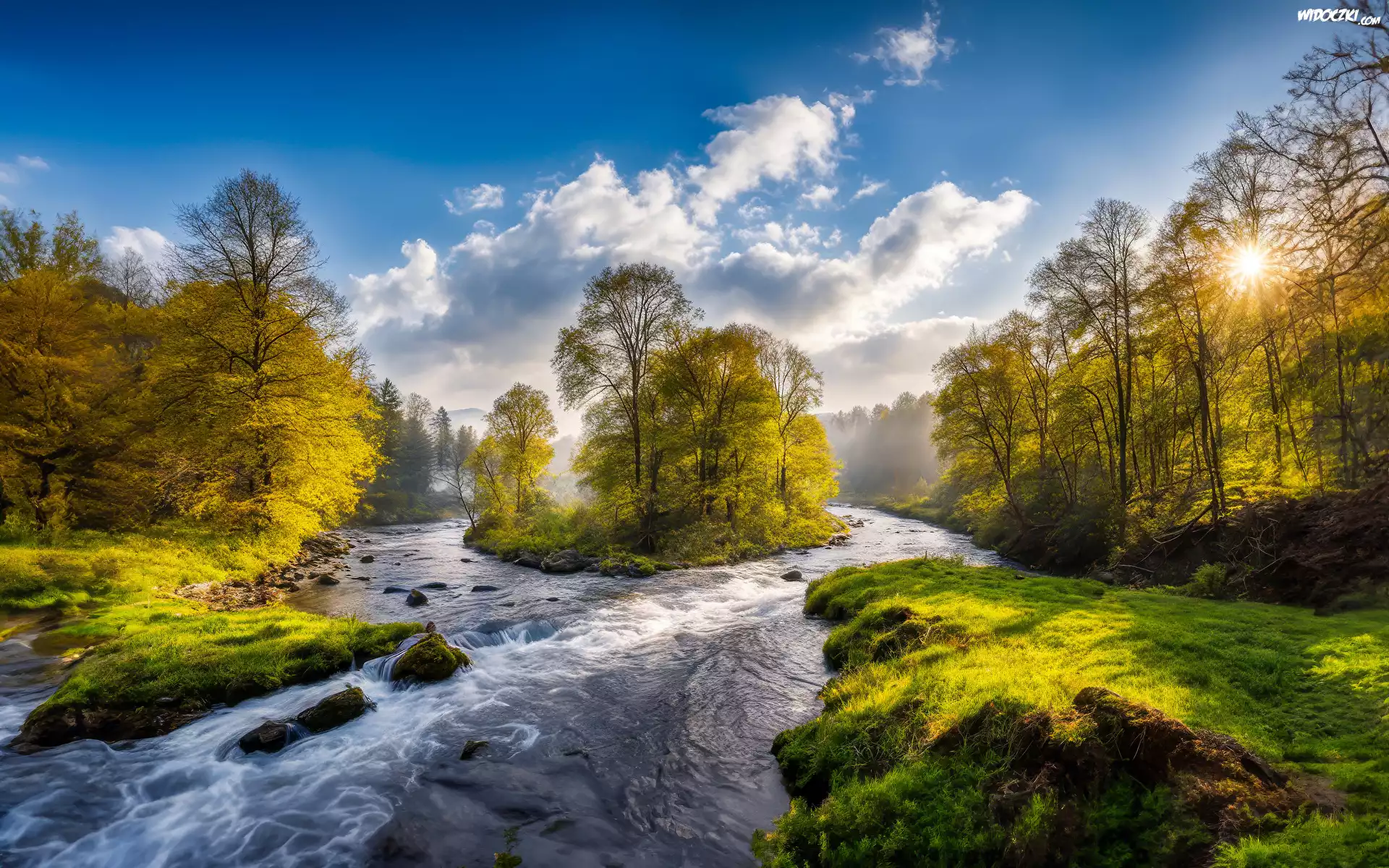 Wschód słońca, Rzeka, Kamienie, Drzewa, Trawa