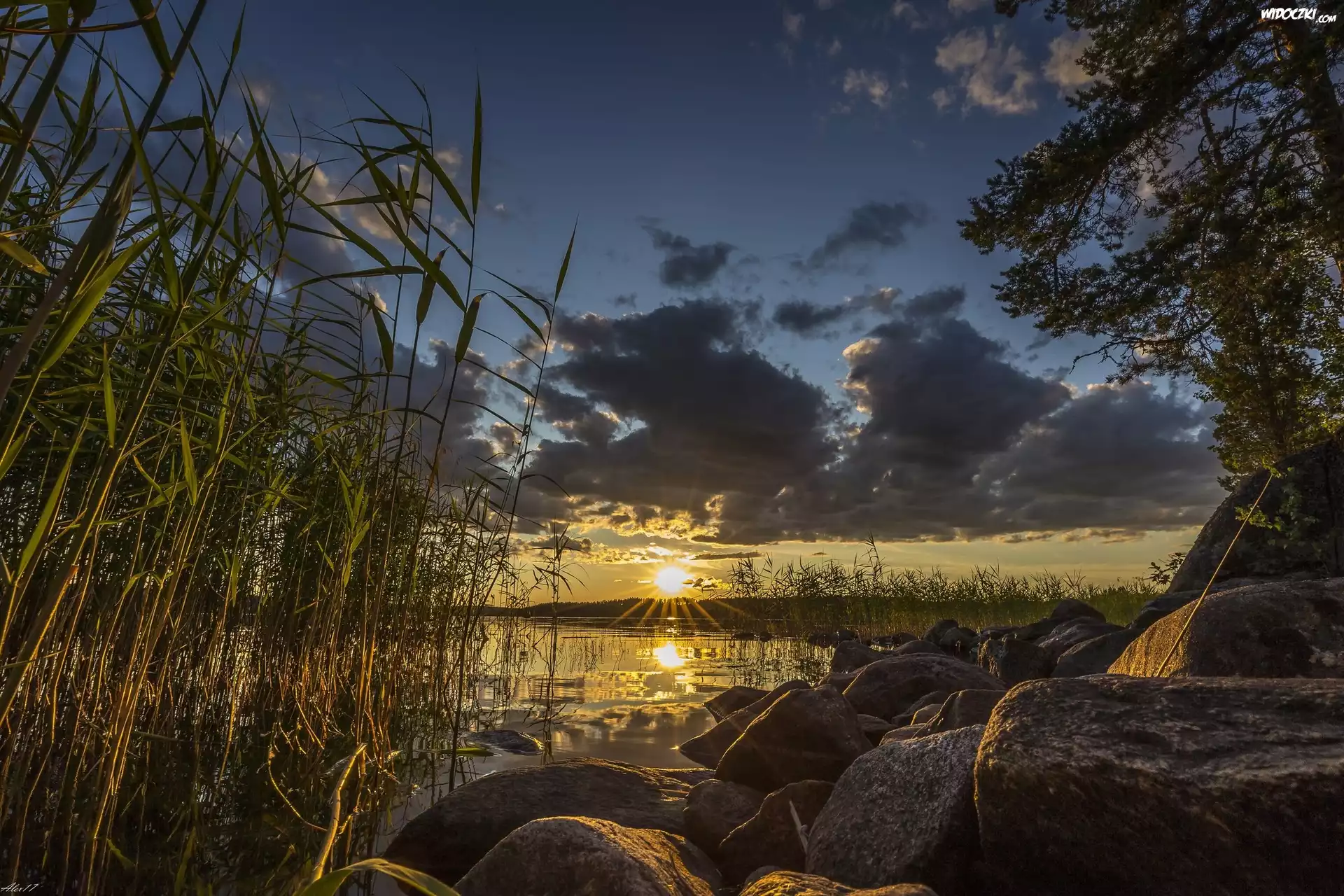 Zdjęcia, Trzciny, Kamienie, Jezioro, Świt, Wschód słońca, Chmury