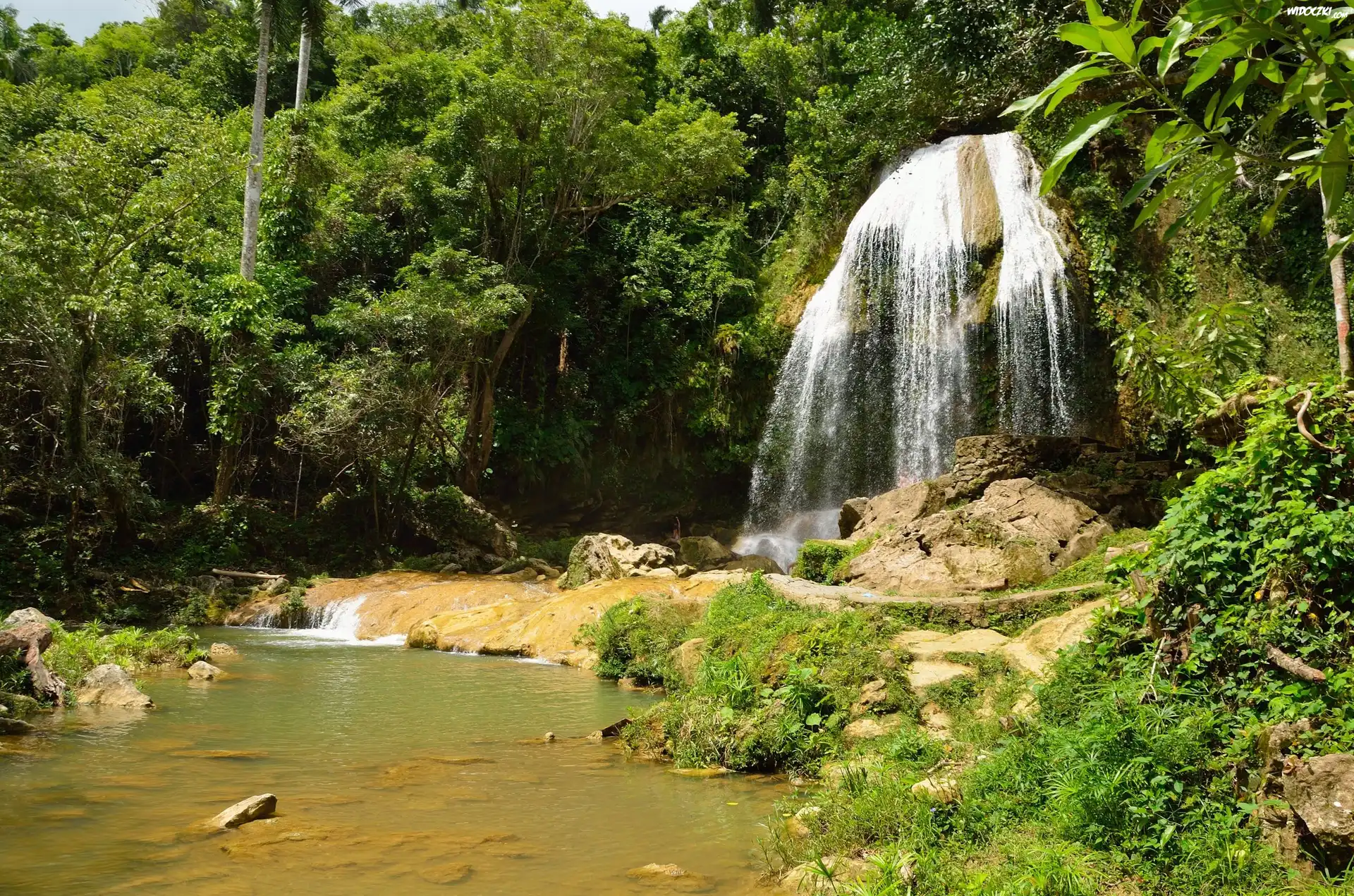 Republika Kuby, Wodospad Salto de Soroa, Drzewa, Trawa, Kamienie