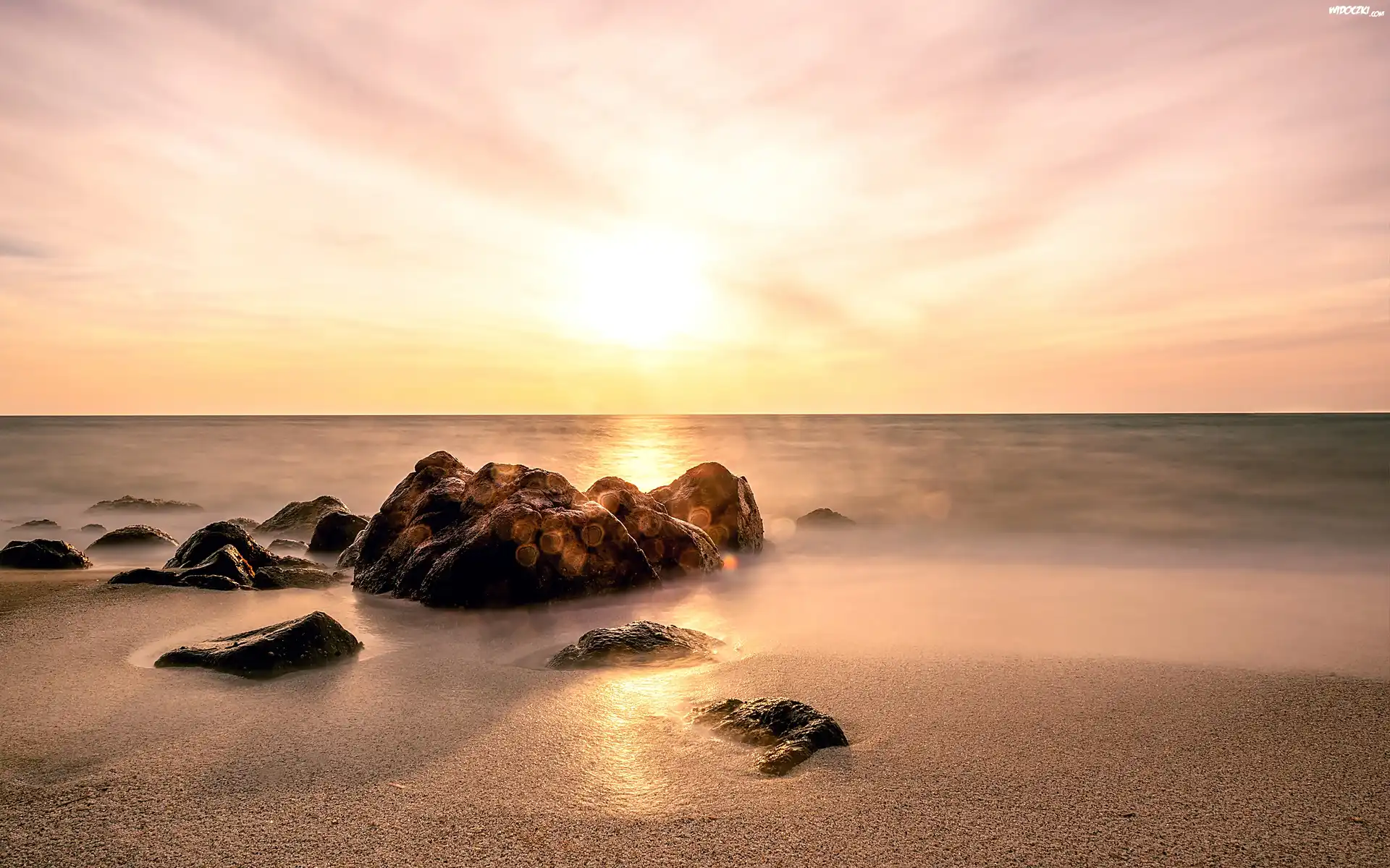 Zdjęcia, Kamienie, Morze, Plaża, Wschód słońca