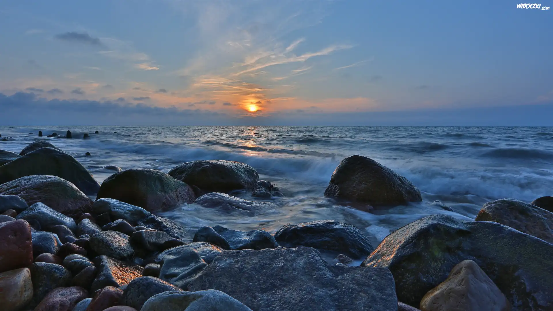Zdjęcia, Kamienie, Morze, Zachód słońca