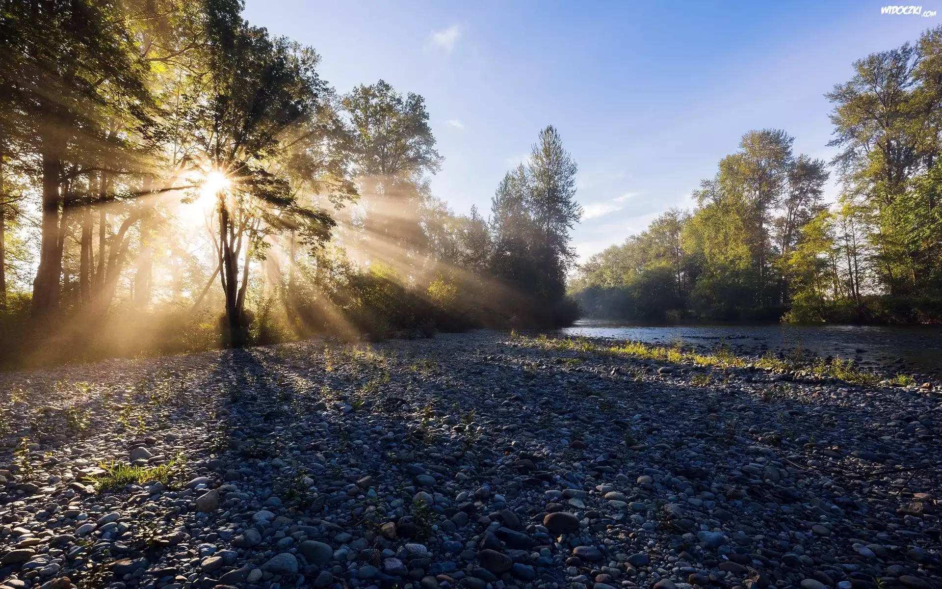 Rzeka, Kamienisty, Brzeg, Świt, Promienie słońca, Drzewa