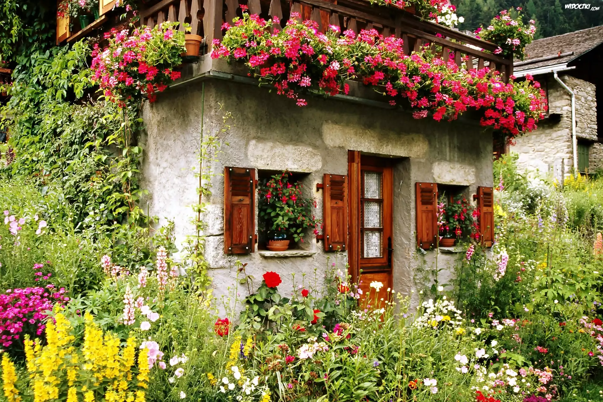 Zdjęcia, Kamienne, Domki, Ogródek, Kwiatowy, Bluszcz, Pelargonie
