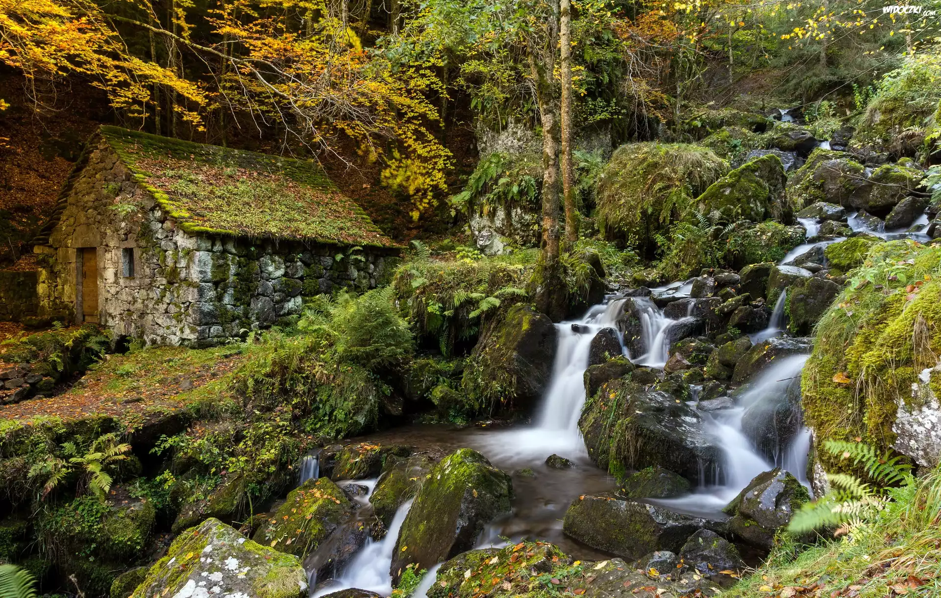 Zdjęcia, Kamienny, Dom, Rzeka, Omszałe, Kamienie, Drzewa