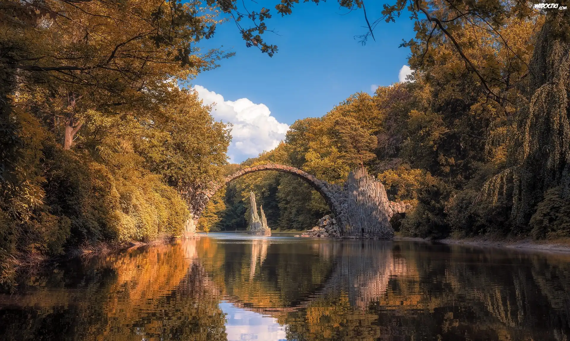 Zdjęcia, Niemcy, Saksonia, Park Rododendronów Kromlau, Kamienny, Most łukowy, Most Diabła, Jezioro Rakotz