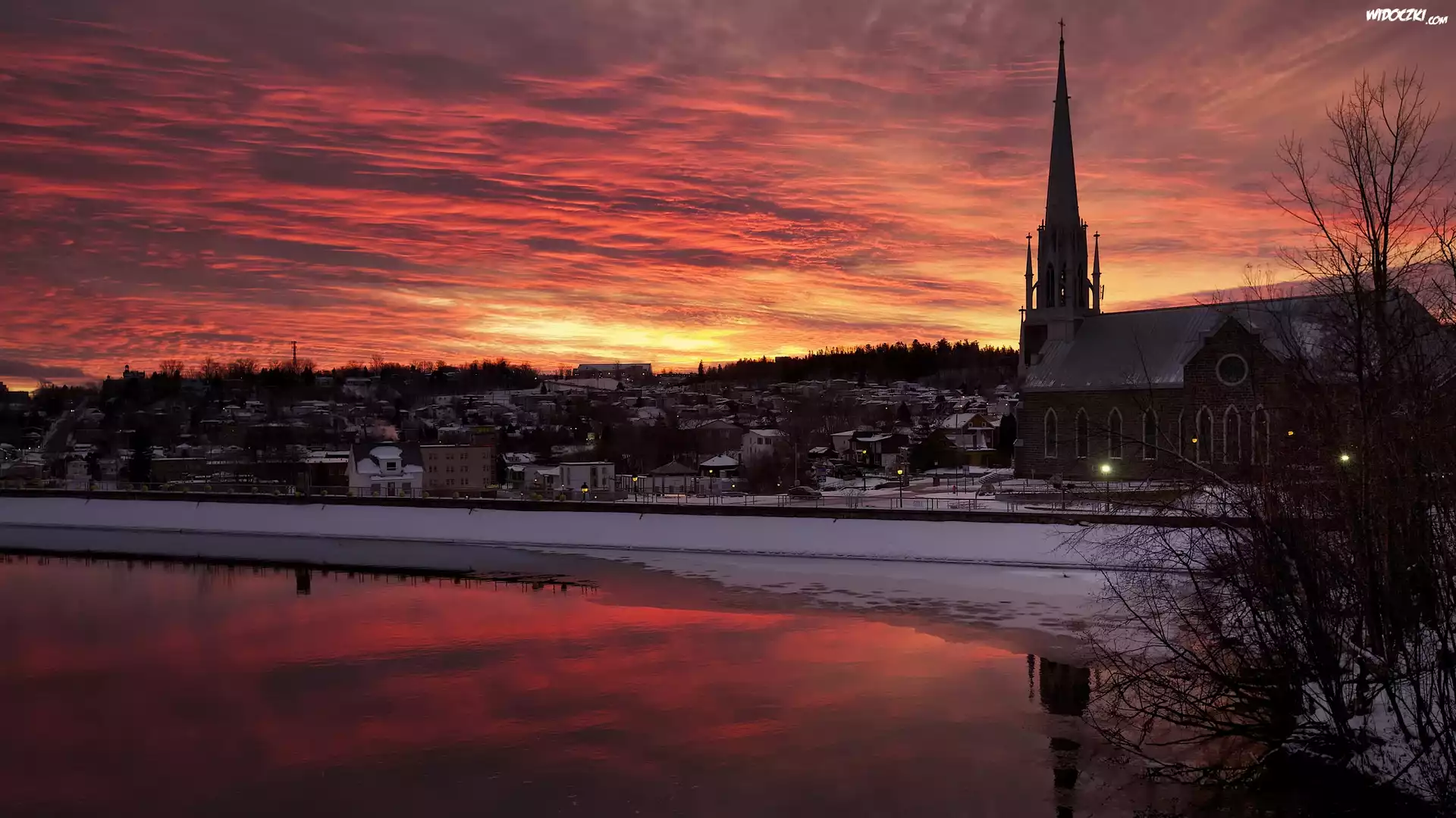 Zdjęcia, Zachód słońca, Kościół, Rzeka Chicoutimi, Miejscowość Bassin, Prowincja Quebec, Kanada