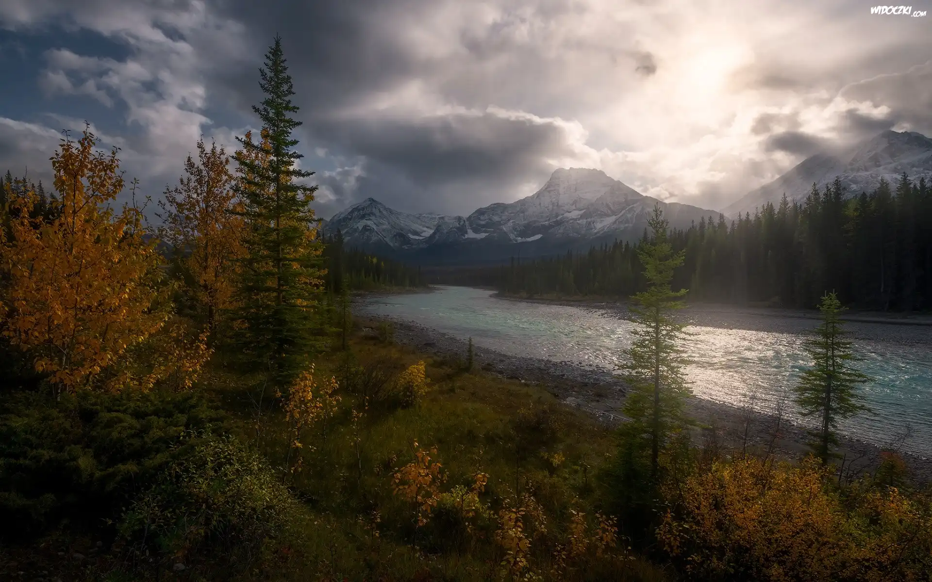 Kanada, Prowincja Alberta, Park Narodowy Jasper, Góry Skaliste, Rzeka, Miette River, Drzewa, Jesień, Ciemne, Chmury |