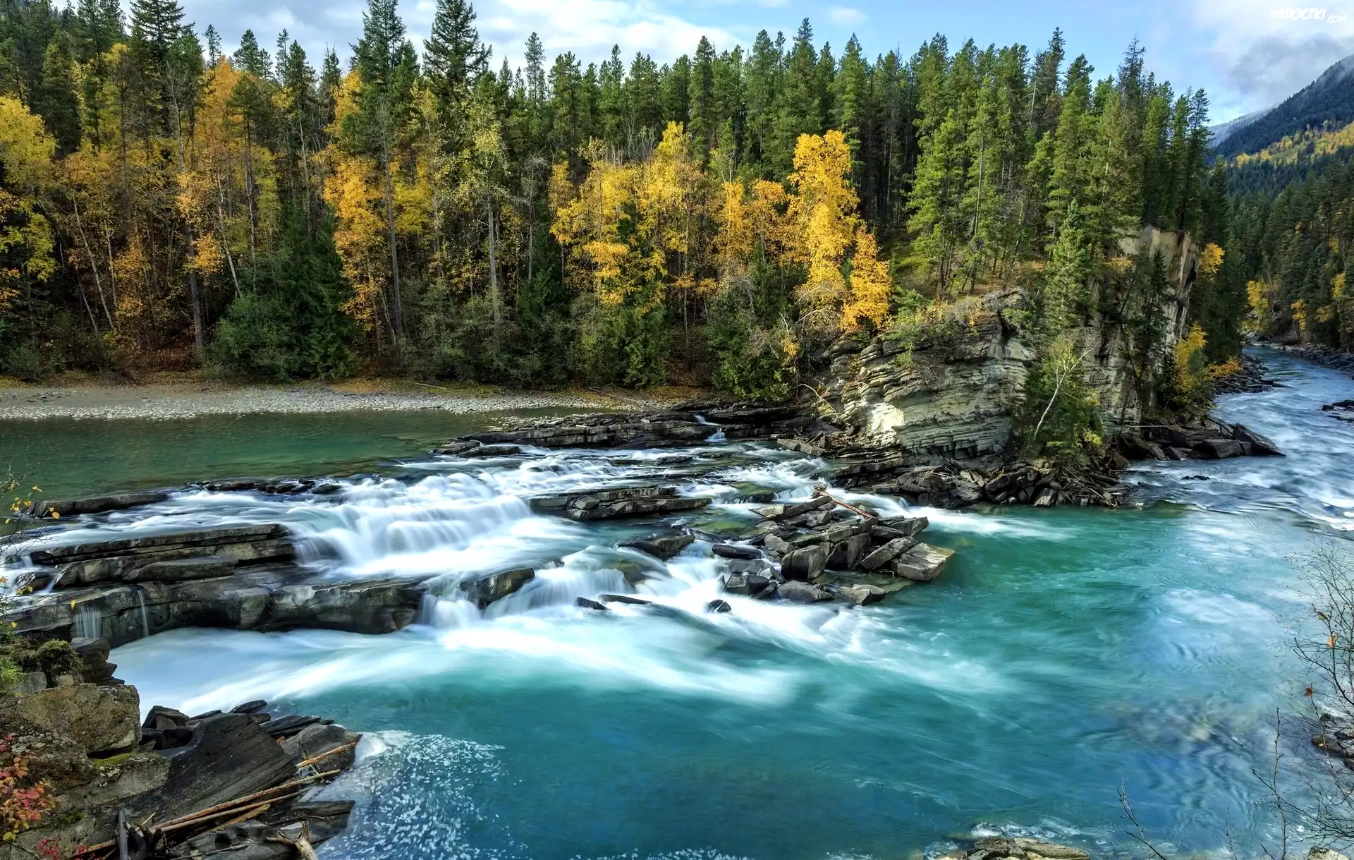Zdjęcia, Rzeka Kicking Horse, Drzewa, Las, Skały, Kolumbia Brytyjska, Kanada