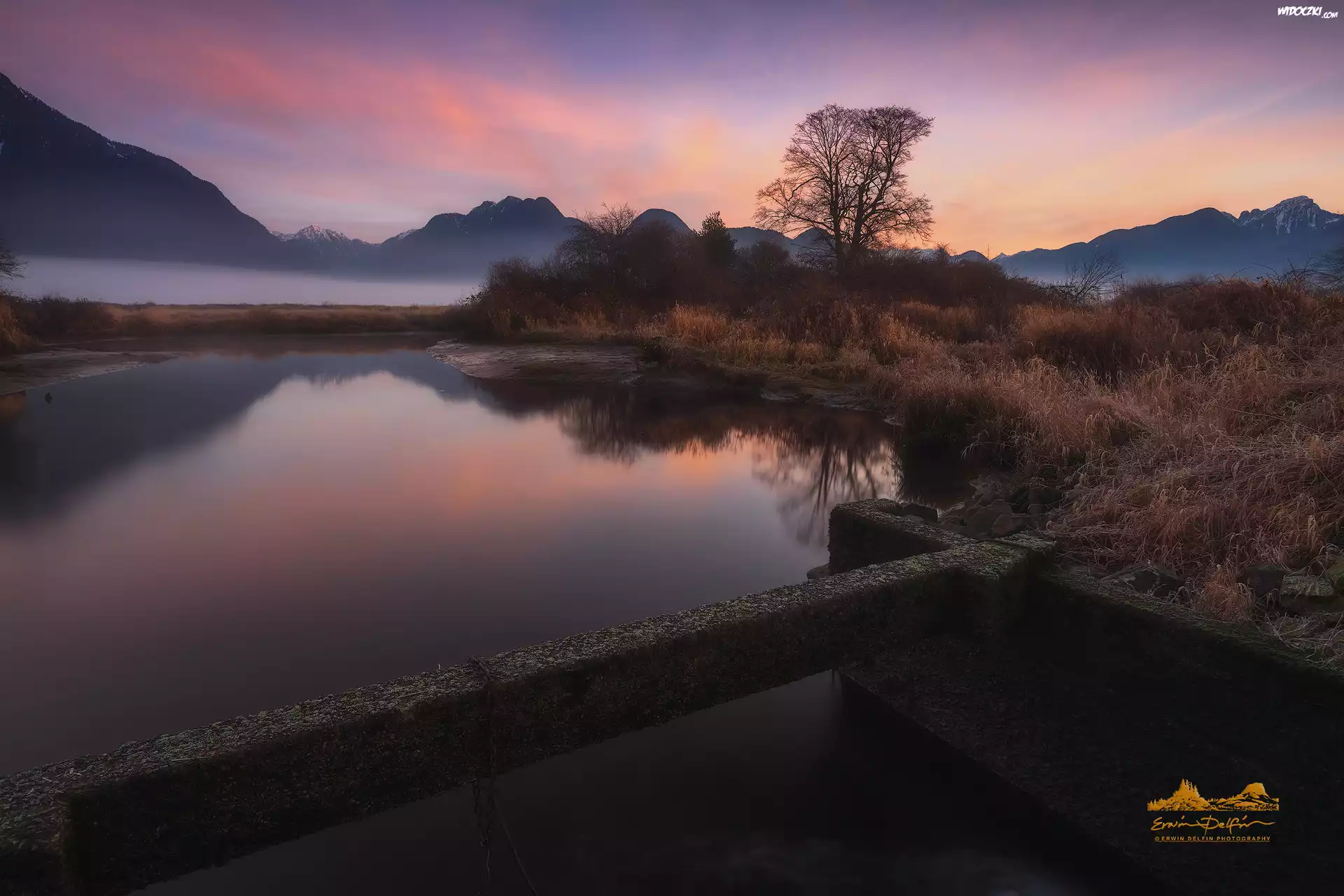 Góry, Mgła, Jezioro Pitt Lake, Drzewa, Kolumbia Brytyjska, Kanada