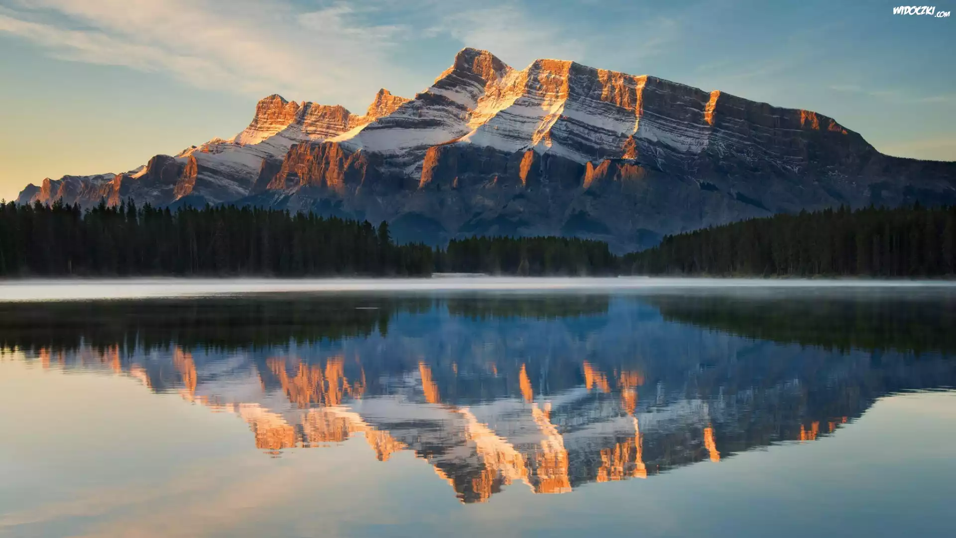 Kanada, Prowincja Alberta, Park Narodowy Banff, Góra Mount Rundle, Jezioro Two Jack Lake, Odbicie, Las, Mgła |