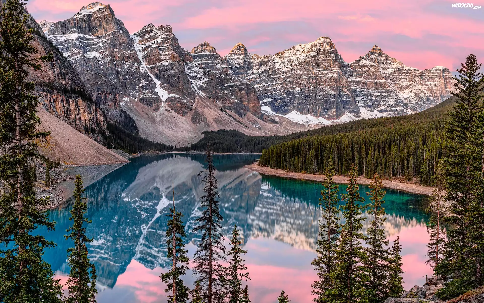 Zdjęcia, Kanada, Alberta, Park Narodowy Banff, Jezioro, Moraine, Drzewa, Góry