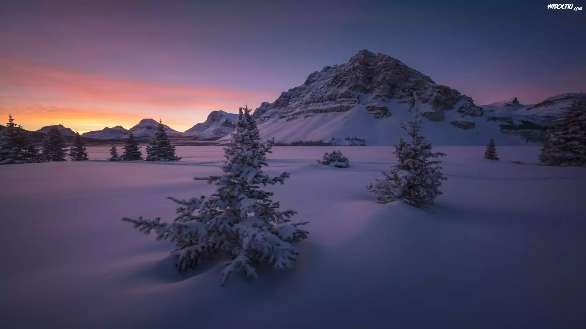 Kanada, Alberta, Park Narodowy Banff, Góra Crowfoot Mountain, Góry, Zima, Wschód słońca, Drzewa |