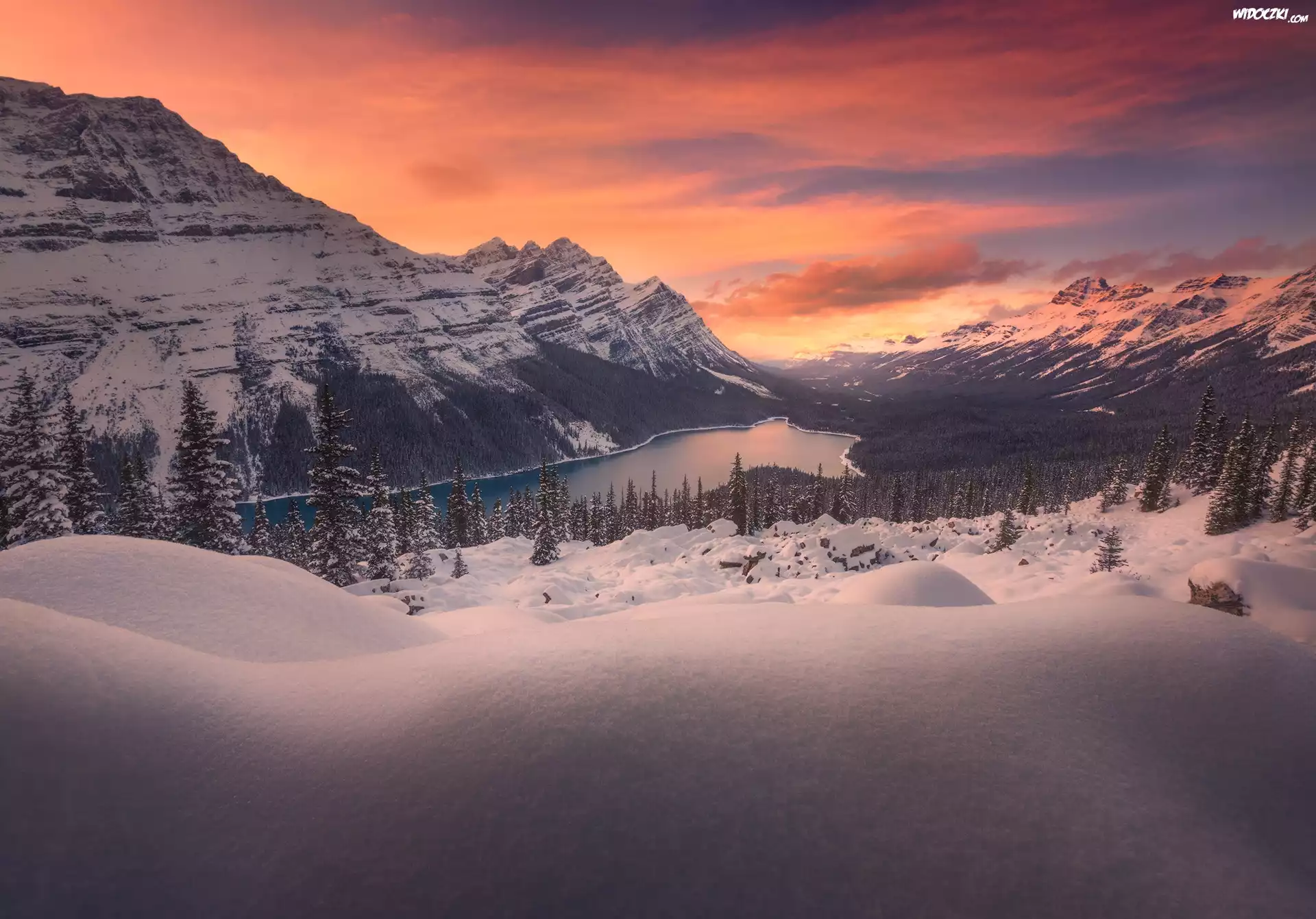 Zdjęcia, Kanada, Alberta, Park Narodowy Banff, Góry Canadian Rockies, Jezioro Peyto Lake, Zachód Słońca