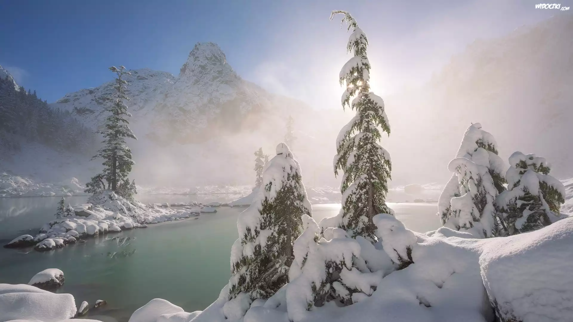 Zdjęcia, Zima, Góry Nadbrzeżne, Jezioro, Ośnieżone, Drzewa, Mgła, Kolumbia Brytyjska, Kanada