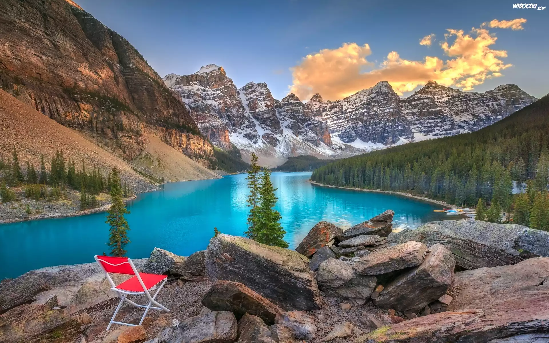 Kanada, Prowincja Alberta, Park Narodowy Banff, Jezioro Moraine, Las, Drzewa, Góry, Czerwone, Krzesło |