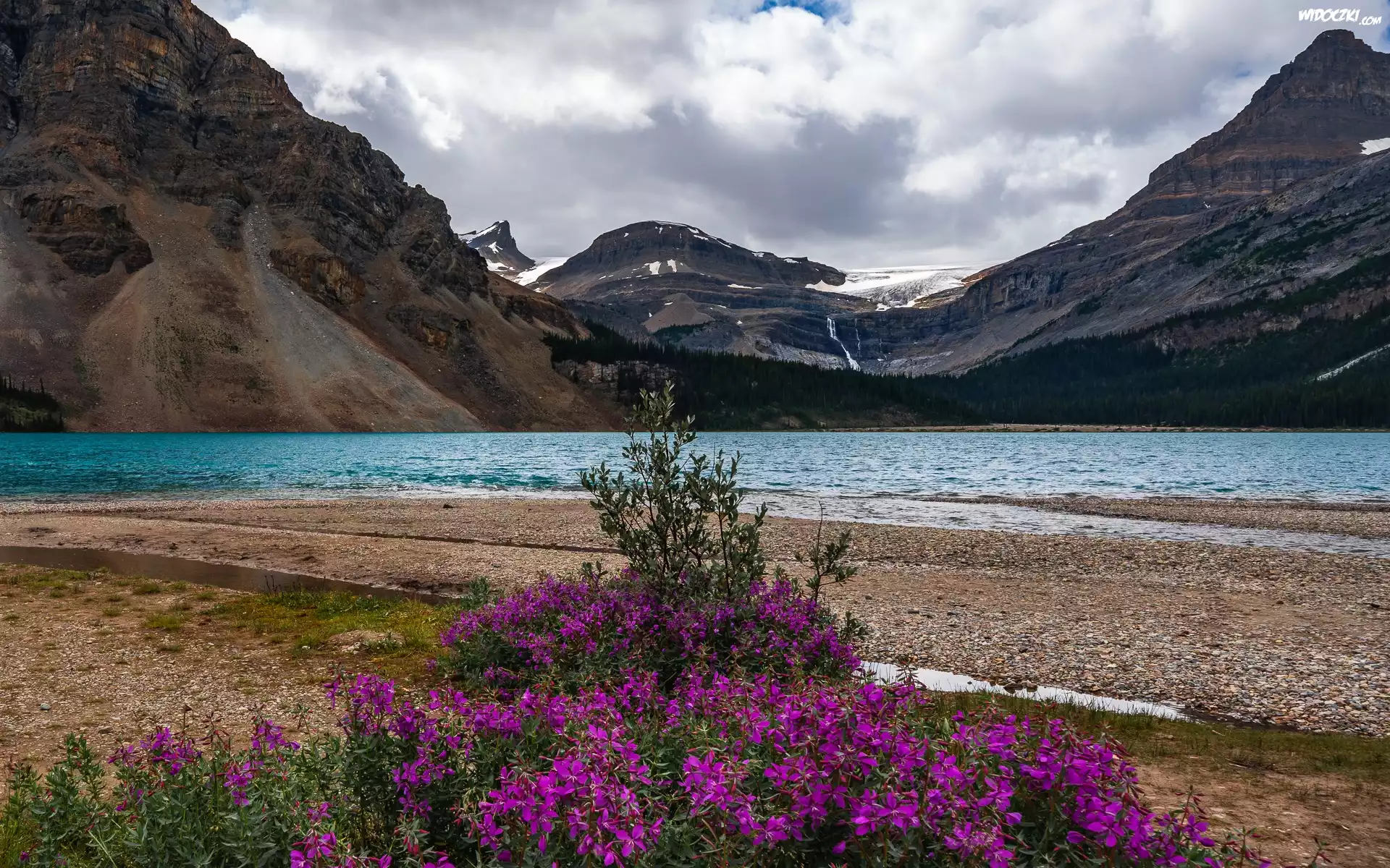 Zdjęcia, Kanada, Prowincja Alberta, Park Narodowy Banff, Jezioro Bow Lake, Góry, Drzewa, Kwiaty, Chmury