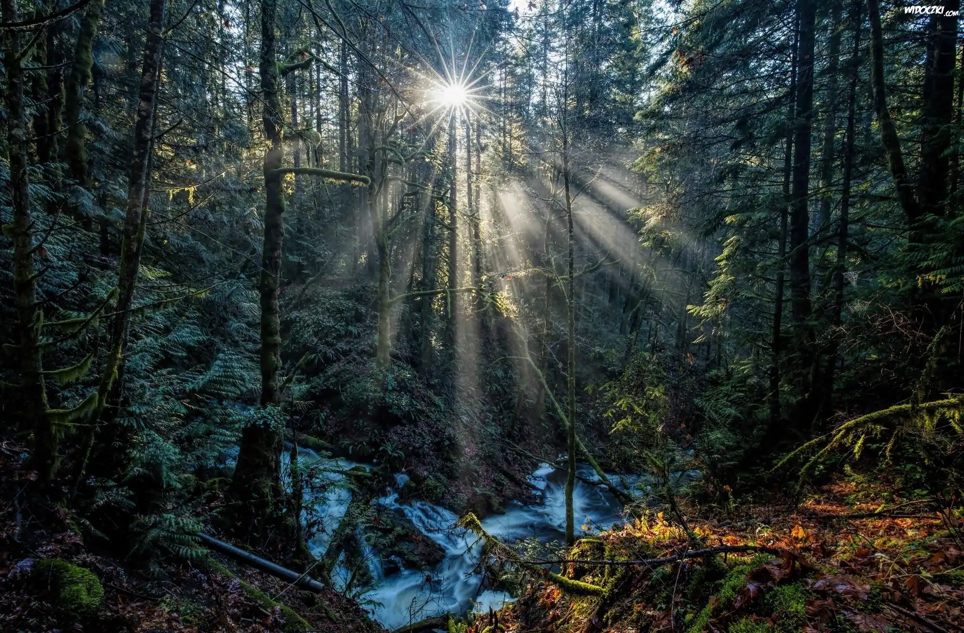 Kanada, Kolumbia Brytyjska, Park Prowincjonalny Gowlland Tod, Potok Tod Creek, Las, Przebijające światło |