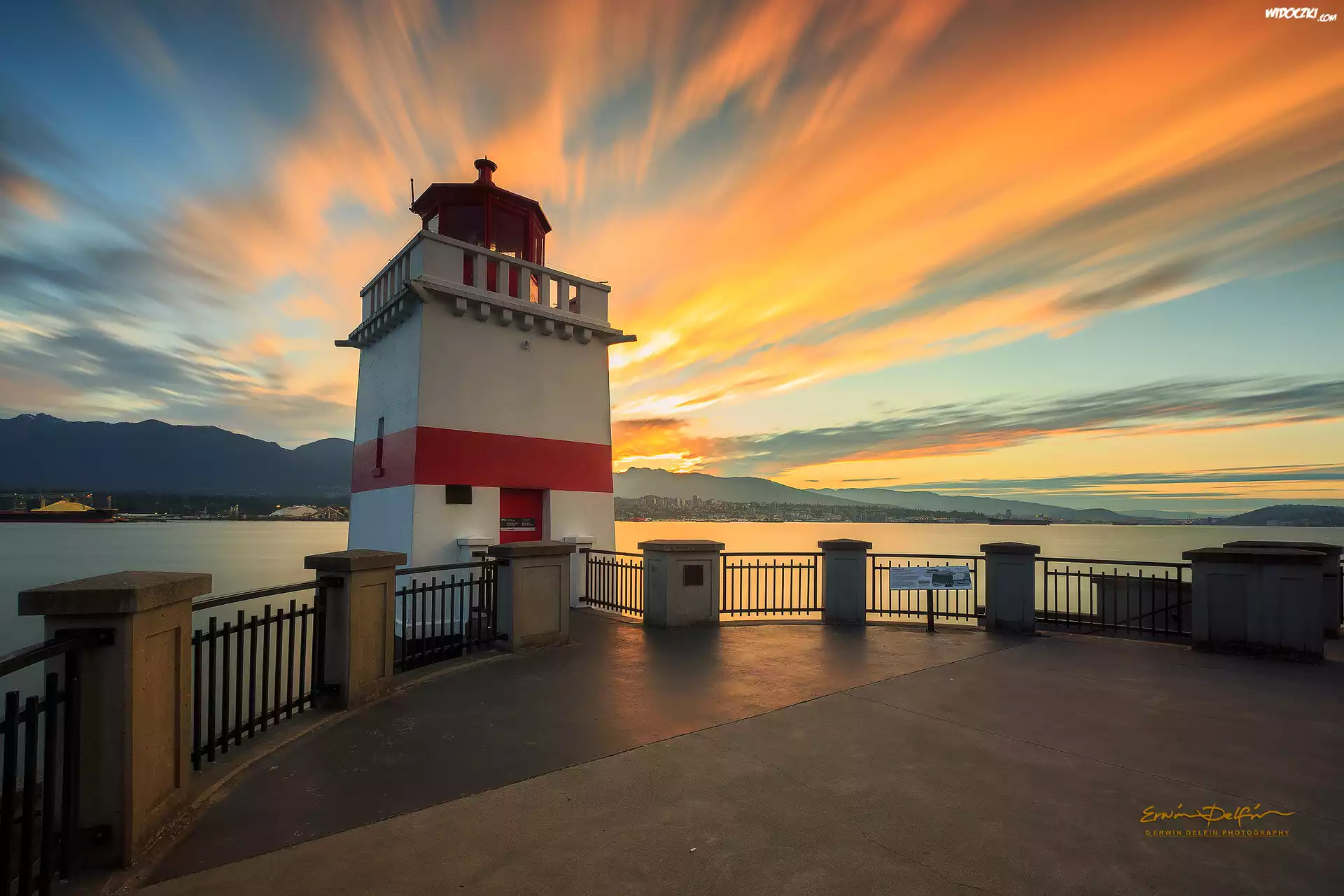 Zdjęcia, Morze, Latarnia morska, Brockton Point, Góry, Wschód słońca, Vancouver, Kanada
