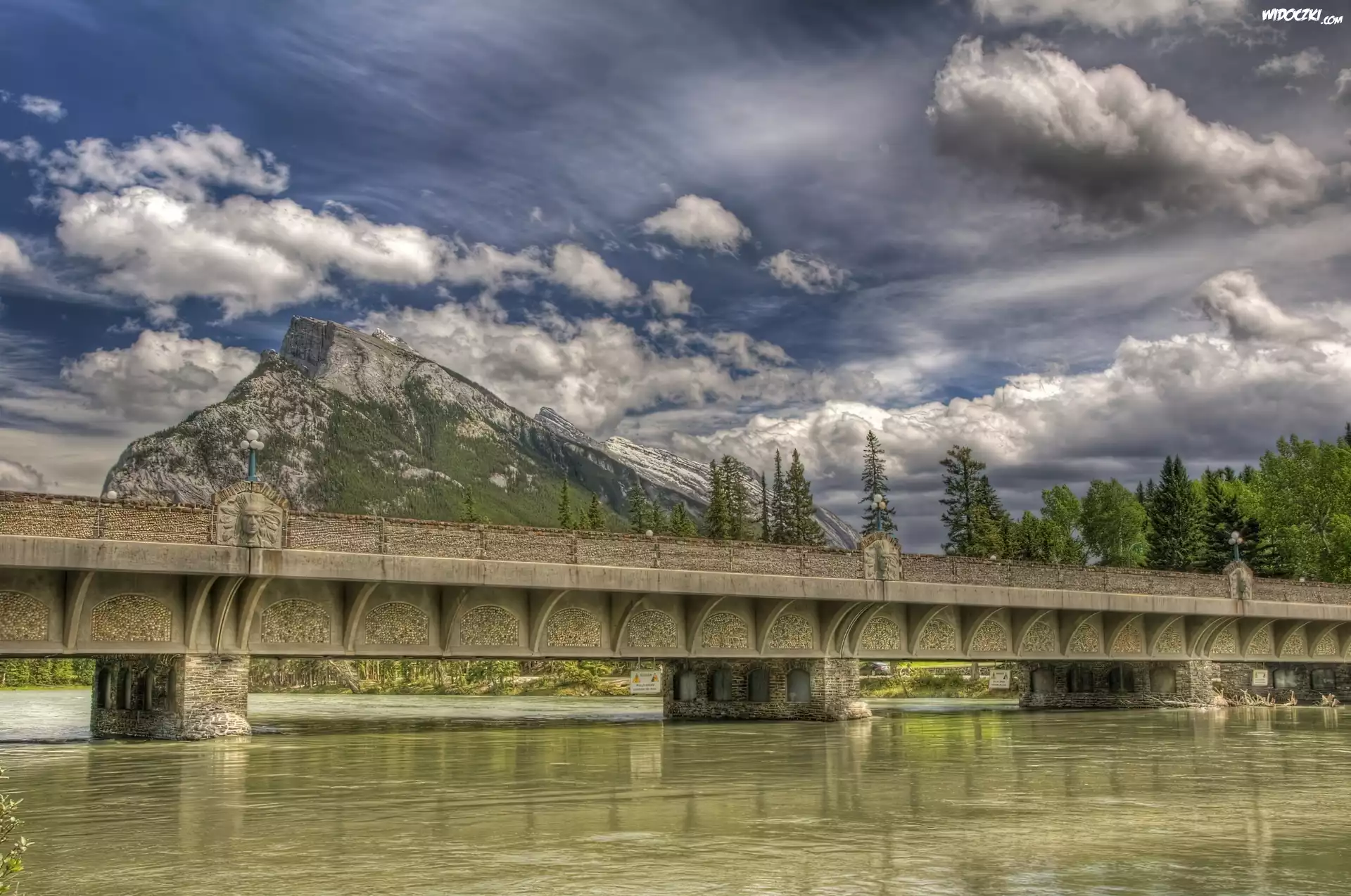 Zdjęcia, Kanada, Most, Góry, Drzewa, Rzeka, Chmury