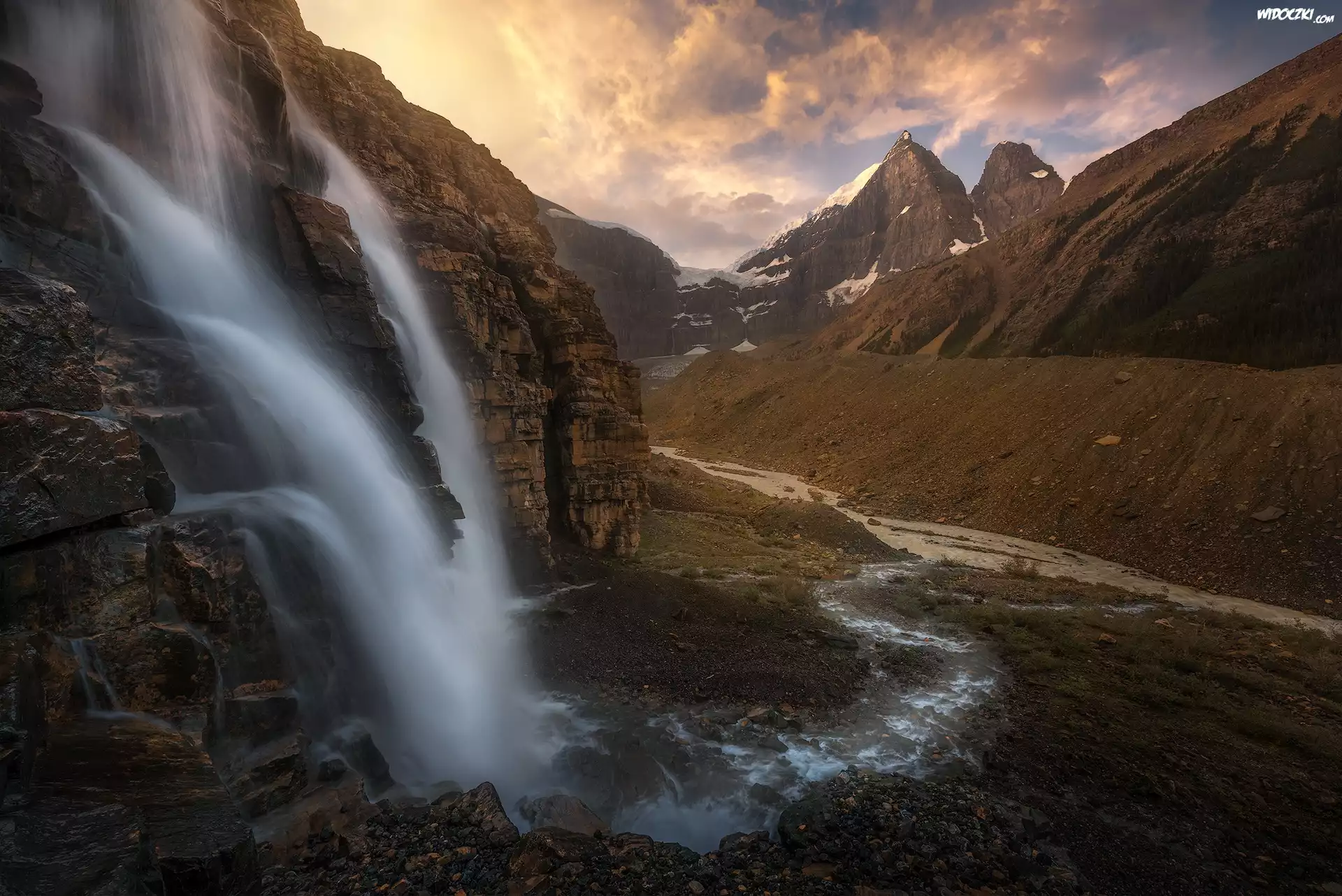 Zdjęcia, Góry Skaliste, Skały, Wodospad, Rzeka, Chmury, Prowincja Alberta, Kanada