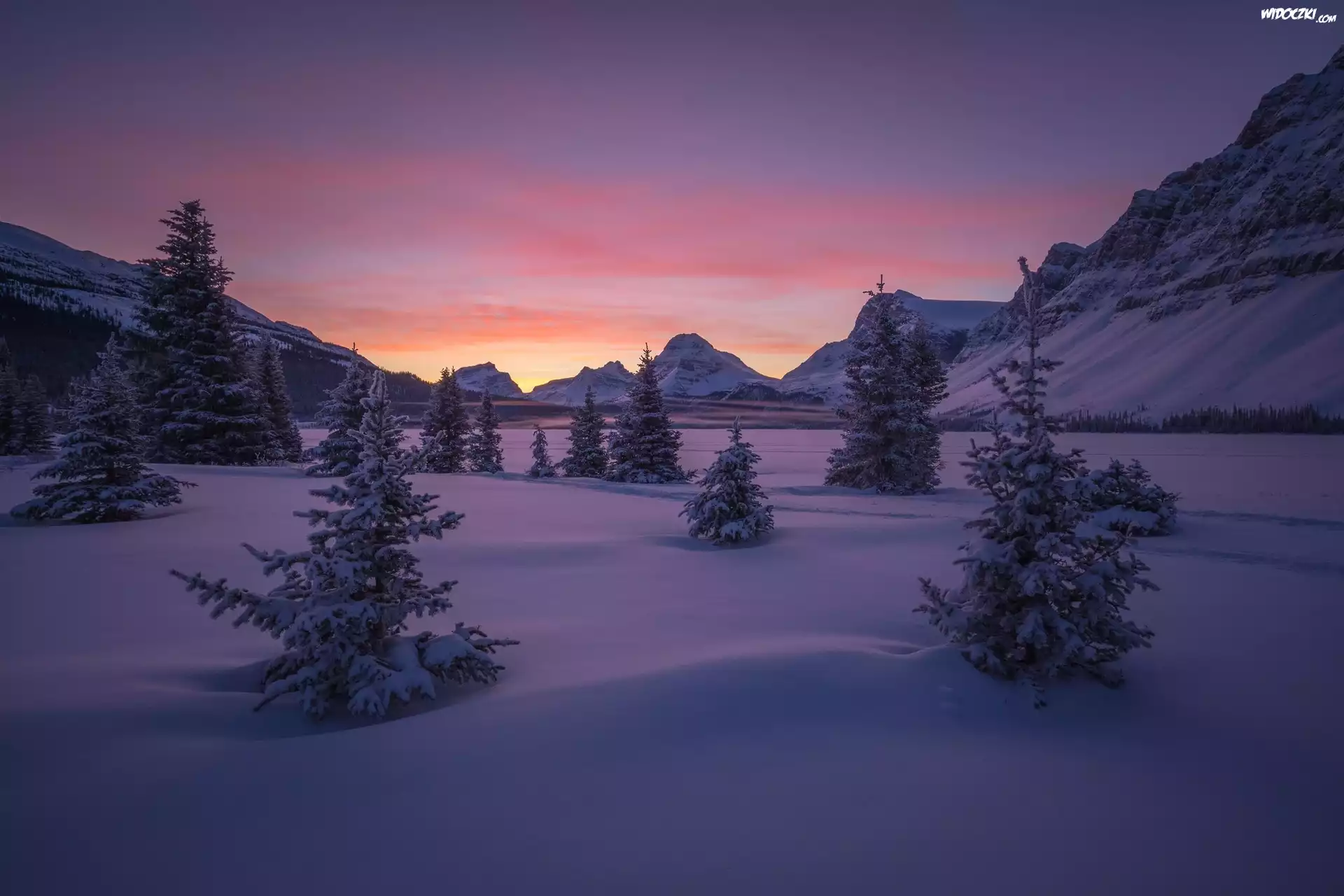 Kanada, Alberta, Park Narodowy Banff, Góra Crowfoot Mountain, Góry, Zima, Zamarznięte, Jezioro Bow Lake, Zachód słońca, Drzewa |