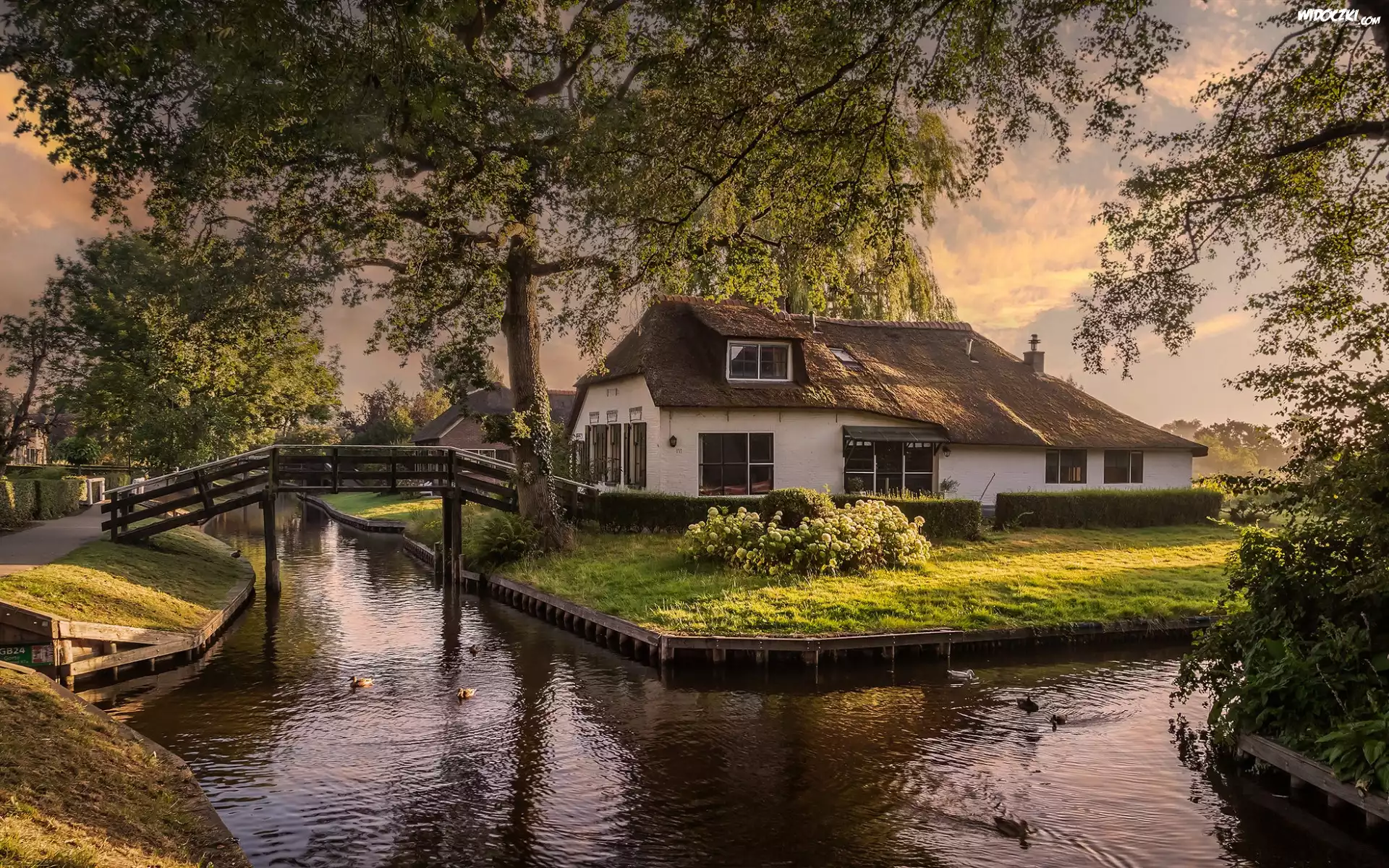 Dom, Mostek, Kwiaty, Kanał, Ptaki, Drzewa, Gałęzie, Odbicie, Brzeg, Kaczki, Chmury, Lato, Rzeka