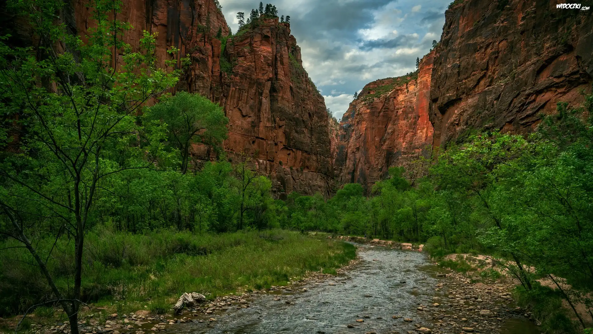 Kanion Zion Narrows, Rzeka, Virgin River, Drzewa, Kamienie, Park Narodowy Zion, Stan Utah, Stany Zjednoczone |