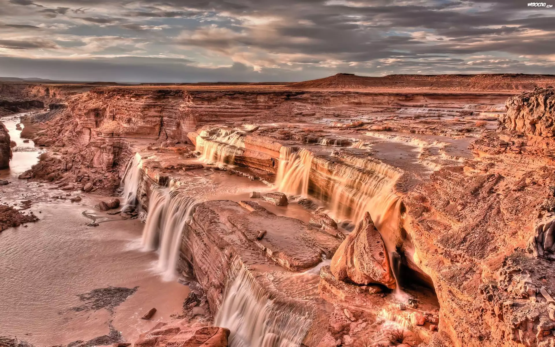 G贸ry, Ska艂y, Urwisko, Wymy艣lona, Kraina Kaniony, Czerwona, Pustynia Dolina, Potok, Trawa, Ska艂y T臋cza, Mg艂a, Kanion Wodospad Jesie艅 Wodospad, W艣r贸d, Ska艂 Kanion, Zach贸d, S艂o艅ca, Chmury Kanion, Niebo Przepi臋kny Wodospad, Drzewa Burza, Nad, Kanionem Kaniony, Rzeka Kanion Wodospad G贸ry, urwisko Kajakarstwo, Wodospad