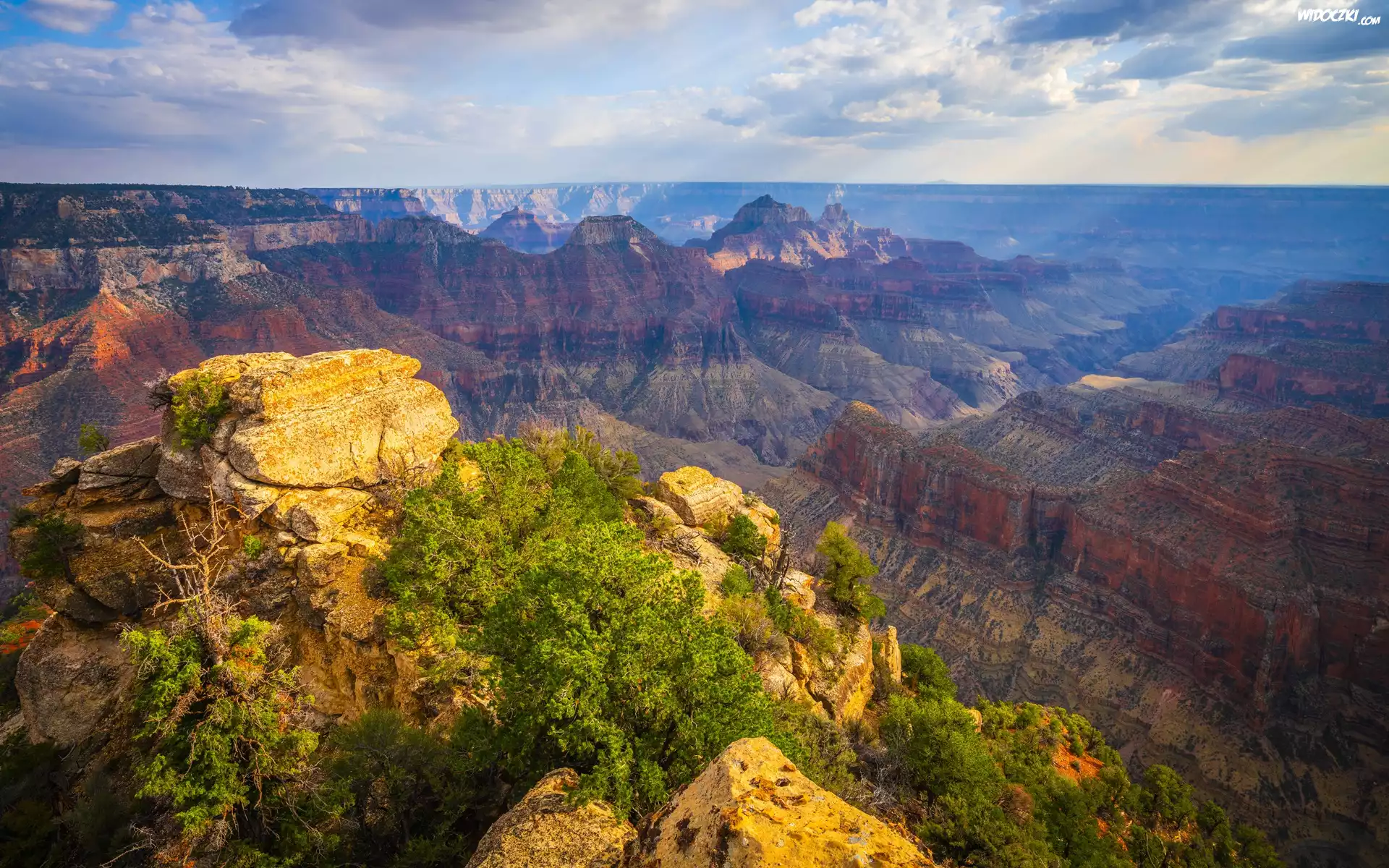 Skały, Góry, Kanion, Grand Canyon, Park Narodowy Wielkiego Kanionu, Drzewa, Chmury, Arizona, Stany Zjednoczone |