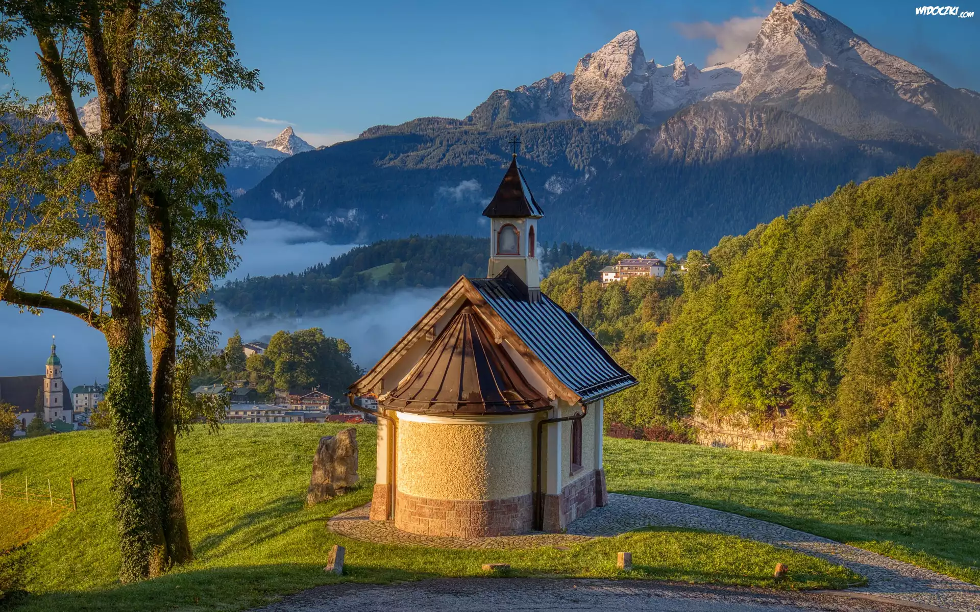 Zdjęcia, Góry, Alpy, Lasy, Drzewa, Kapliczka, Kirchleitn Kapelle, Mgła, Berchtesgaden, Bawaria, Niemcy