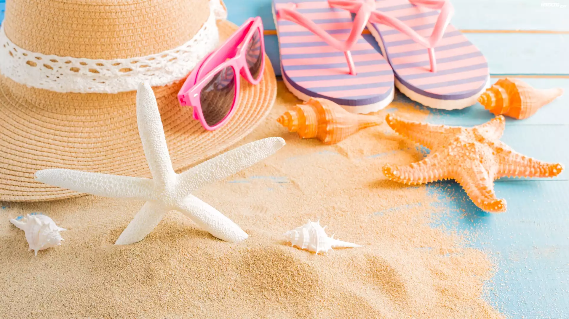 Piasek, Kapelusz, Okulary, Klapki, Muszelki, Rozgwiazdy, Lato