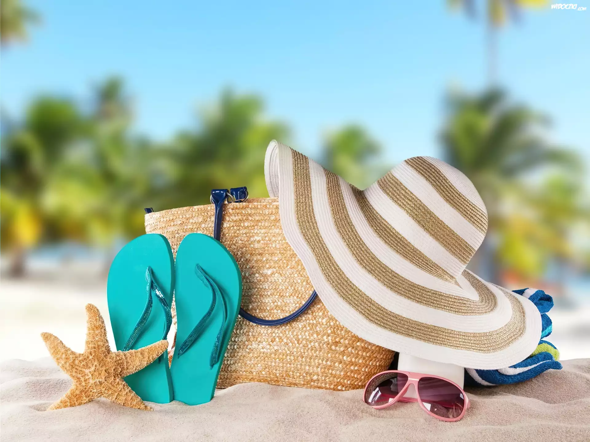 Zdjęcia, Plaża, Kapelusz, Okulary, Rozgwiazda, Palmy, Tropiki, Lato