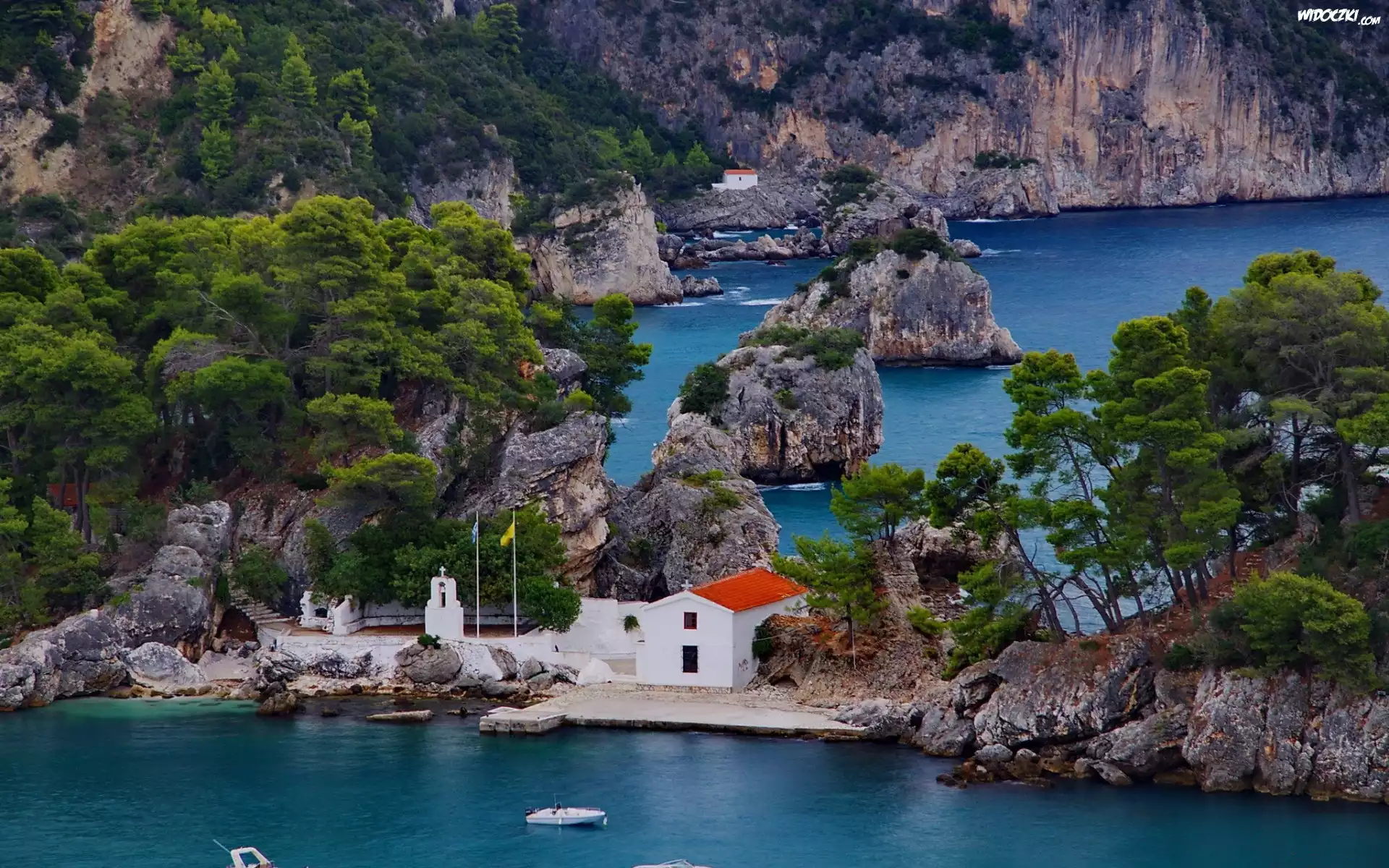 Kaplica, Góry, Skały, Jezioro, Drzewa
