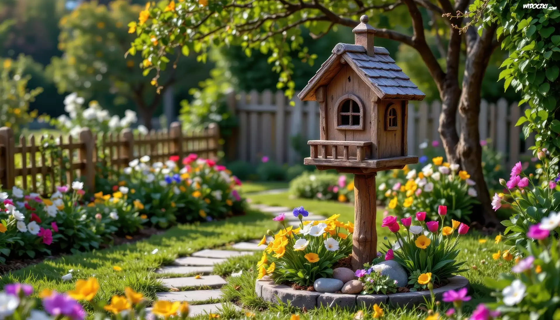 Ogród, Dekoracja, Domek, Karmnik, Kwiaty, Drzewa, Ogrodzenie