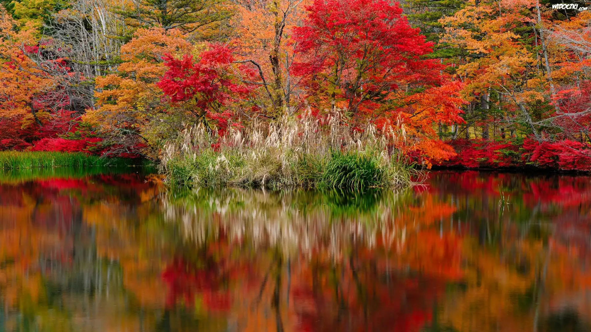 Zdjęcia, Jesień, Staw, Kumoba Pond, Kolorowe, Drzewa, Kępy, Trawy, Odbicie, Karuizawa, Nagano, Japonia