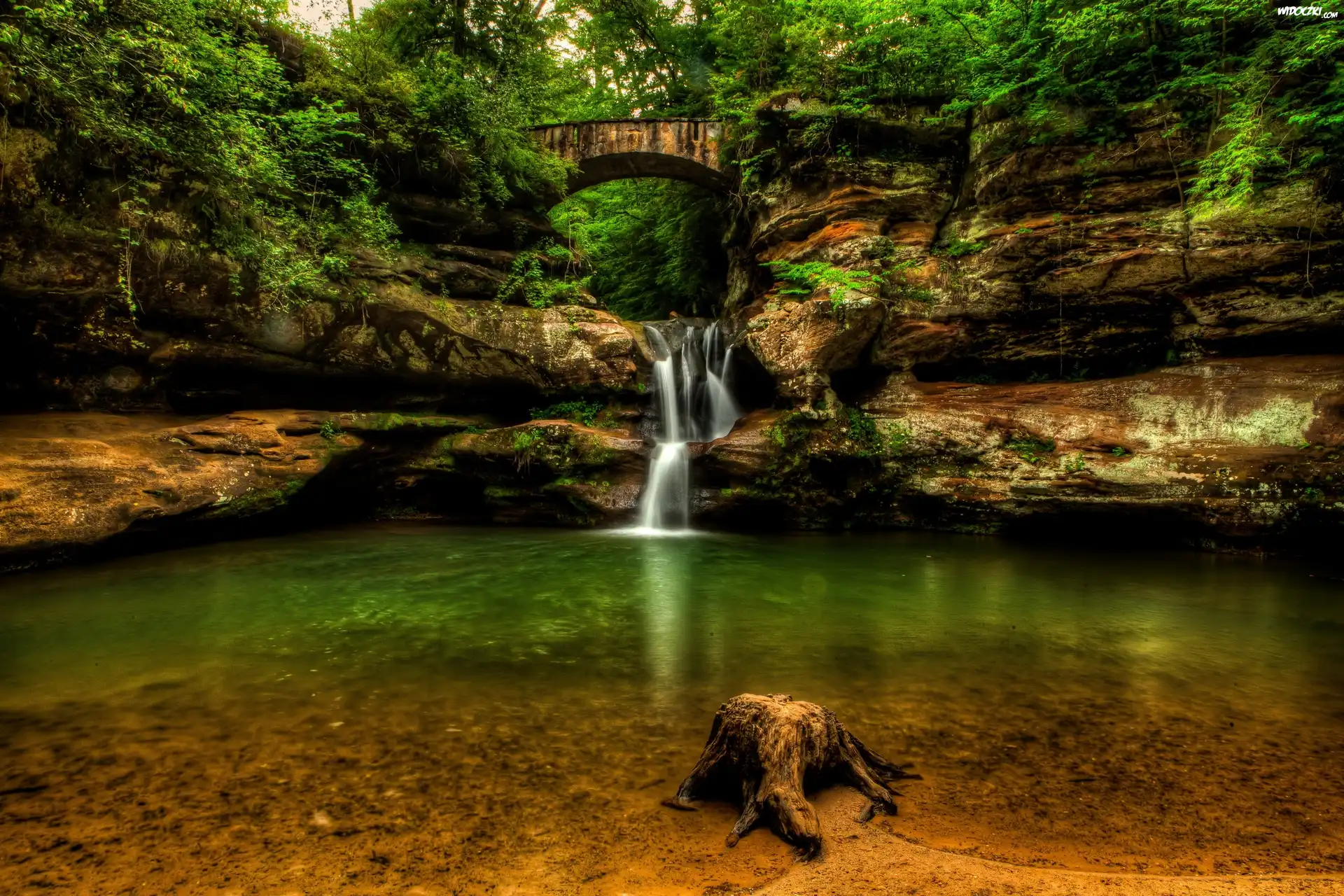 Zdjęcia, Kaskada, Most, Roślinność, Skały