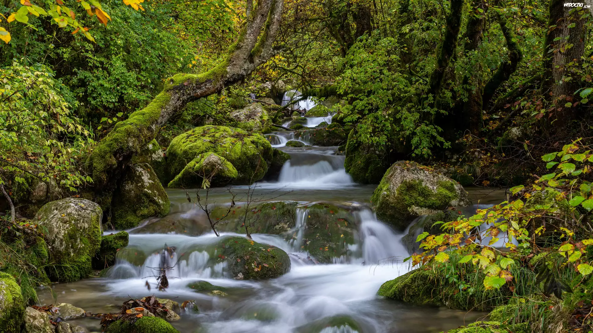 Zdjęcia, Rzeka, Kaskada, Las, Drzewa, Omszałe, Kamienie, Rośliny, Trawa